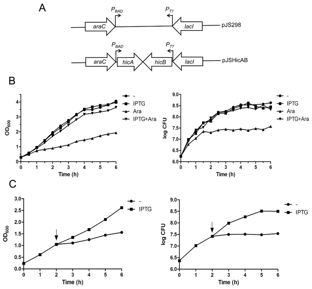 In growth assays, E. coli BL21(DE3)/pLysS cells harboring the plasmid pJSHicAB were cultured in 100 mL of LB broth supplemented with 50 μg/mL kanamycin and 0.2% glucose to an OD600 of ~0.3. For selective expression of hicA and hicB genes, the culture was divided into four equal parts, of which three were provided with 1 mM of IPTG, 0.2% l-arabinose (Ara) and both (Sangon Biotech, Shanghai, China), respectively. The cultures were continued at 37 °C for 6 h, and aliquots were removed every 30 min for measurement of OD600 and enumeration of CFU. In the kill/rescue assay, E. coli culture was supplemented with 0.2% l-arabinose at an OD600 of ~0.3 and continued for 2 h. Then, the culture was divided into two equal parts, of which one was supplemented with 1 mM of IPTG. The cultures were continued for 4 h, and the OD600 and CFU were assessed every 1 h.