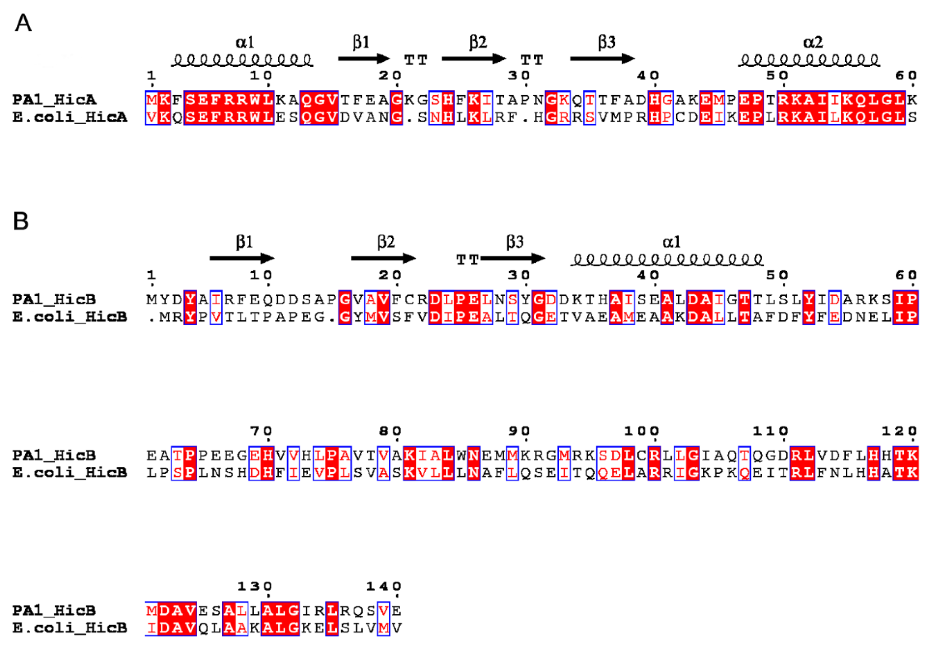 Sequence alignments of the P. aeruginosa HicAB system with related homologs. (A) Alignment of the HicA proteins. (B) Alignment of the HicB proteins. Identical residues are shown as white letters with red background, and similar residues are shown as red letters with white background. The predicted secondary structures of P. aeruginosa HicA and HicB are shown at the top. α: α-helix; β: β-sheet; T: turn.