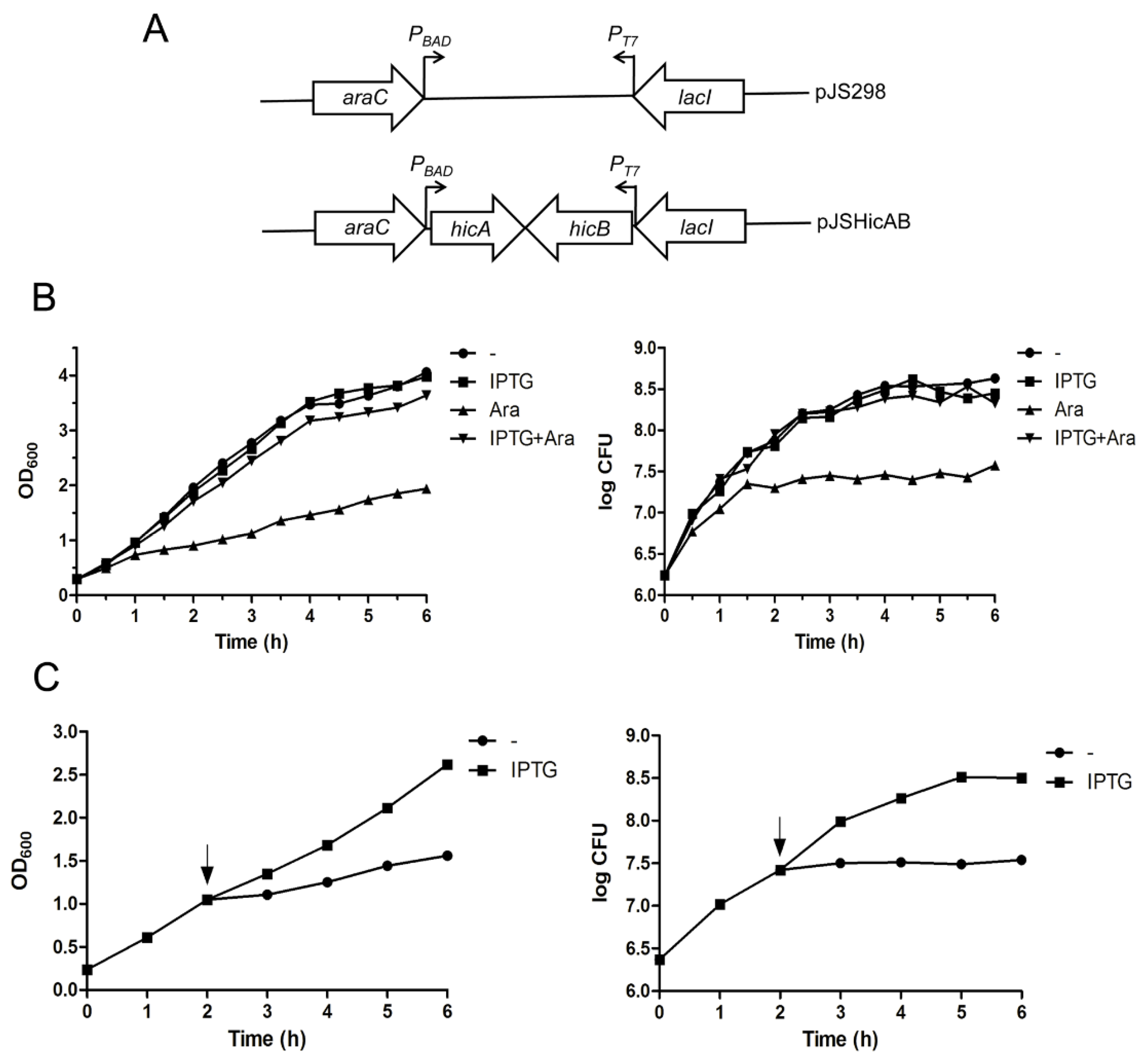 In growth assays, E. coli BL21(DE3)/pLysS cells harboring the plasmid pJSHicAB were cultured in 100 mL of LB broth supplemented with 50 μg/mL kanamycin and 0.2% glucose to an OD600 of ~0.3. For selective expression of hicA and hicB genes, the culture was divided into four equal parts, of which three were provided with 1 mM of IPTG, 0.2% l-arabinose (Ara) and both (Sangon Biotech, Shanghai, China), respectively. The cultures were continued at 37 °C for 6 h, and aliquots were removed every 30 min for measurement of OD600 and enumeration of CFU. In the kill/rescue assay, E. coli culture was supplemented with 0.2% l-arabinose at an OD600 of ~0.3 and continued for 2 h. Then, the culture was divided into two equal parts, of which one was supplemented with 1 mM of IPTG. The cultures were continued for 4 h, and the OD600 and CFU were assessed every 1 h.