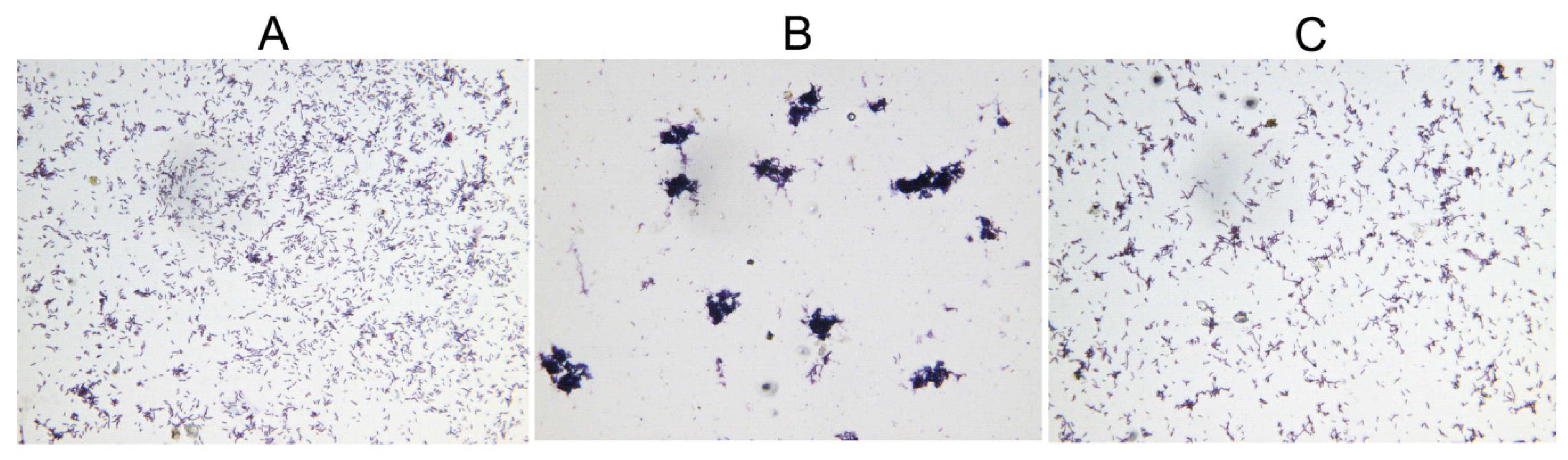 HicA overproduction causes aggregation of E. coli cells, which can be reverted by HicB induced subsequently. (A) Control; (B) Induction of HicA; (C) Subsequent induction of HicB. Microscopic images of E. coli cells were captured digitally (Gram staining, ×400).
