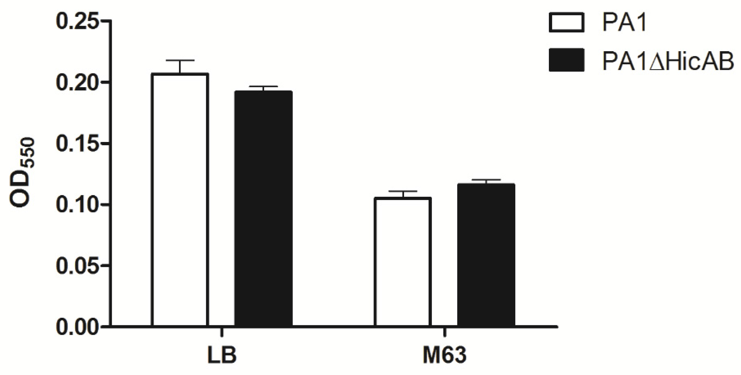 Biofilm formation of PA1 and PA1∆HicAB in LB and M63 broth. Biofilm was formed at 37 °C for 24 h, washed and stained with crystal violet, then the OD550 was measured. No statistically-significant difference between PA1 and PA1∆HicAB was observed in either media (p > 0.05). Data are expressed as the mean ± SEM of three independent experiments.