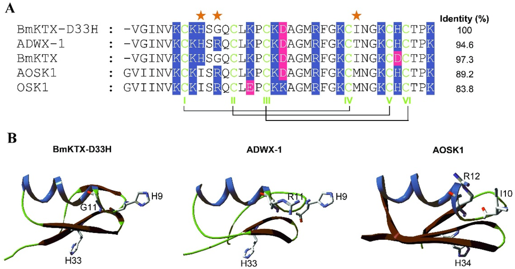 Alignment of amino acid sequences of toxins belonging to the α-KTx3 family. (A) The conserved half-cystine residues that form disulfide bonds are shown in green; basic residues are shown in blue shadow; acidic residues are shown in pink shadow. The three distinct amino acid residues (at positions 9, 11 and 28) between BmKTX-D33H and other relevant toxins are highlighted as “red stars”; (B) The locations of the main different amino acid residues between BmKTX-D33H and its structurally related toxins. The BmKTX-D33H structure is modeled using the BmKTX structure as its molecular template (PDB code: 1BKT); ADWX-1 structure (PDB code: 2K4U); AOSK1 structure (PDB code: 2CK4).
