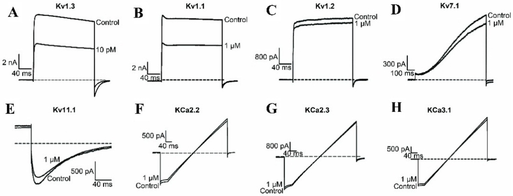 Whole cell patch-clamp recordings of Kv1.3 channel were obtained from human T cells. Electrophysiological experiments of other assayed potassium channels were performed on HEK293 cells transfected with cDNA encoding Kv1.1, Kv1.2, Kv1.3, Kv7.1, Kv11.1, KCa2.2, KCa2.3, and KCa3.1 channels using TurboFect Reagent (ThermoSci., Waltham, MA, USA). The cDNAs were subcloned into the Xho I/Bam HI sites of pIRES2-EGFP, a bicistronic expression vector (Clontech, Mountain View, CA, USA) coexpressed with enhanced GFP. The constructs were verified by DNA sequencing. Currents were recorded on eGFP-expression positive cells one to three days post-transfection. Electrophysiological experiments were performed using protocols according to previously published references. Cells were bathed with mammalian Ringer’s solution: 5 mM KCl, 140 mM NaCl, 2 mM CaCl2, 1 mM MgCl2, 10 nM HEPES, 10 mM d-glucose (adjusted to pH 7.4 with NaOH). A multichannel microperfusion system MPS-2 (INBIO Inc, Wuhan, China) was used to exchange the external recording bath solution. The recording pipette solution contained 140 mM KCl, 1 mM MgCl2, 1 mM EGTA, 1 mM Na2ATP, 5 mM HEPES (adjusted to pH 7.4 with NaOH). All ion channel currents were elicited by depolarizing voltage steps of 200 ms from the holding potential −80 mV to +50 mV. Membrane currents were measured with an EPC 10 patch clamp amplifier (HEKA Elektronik, Lambrecht/Pfalz, Germany) interfaced to a computer running acquisition and analysis software (Pulse, v8.80, HEKA Elektronik, Lambrecht/Pfalz, Germany). Analysis of the data was performed with IgoPro (WaveMetrics, Lake Oswego, OR, USA). The results are mainly shown as the mean ± S.E. of at least three experiments.