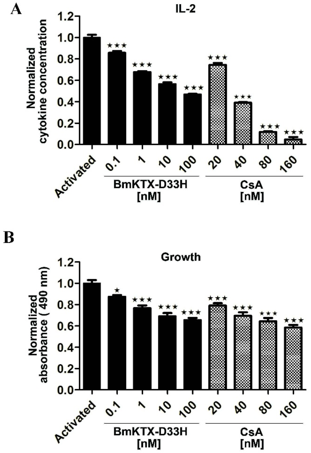 In vitro effect of BmKTX-D33H on Jurkat cell functions. Jurkat cells were stimulated with 100 ng/mL PMA and 1 mM Ionmycin. (A) Inhibition of IL-2 production in the absence or presence of BmKTX-D33H or CsA, respectively; (B) Proliferation of activated Jurkat cells was suppressed in the presence of BmKTX-D33H or CsA, respectively. *** p < 0.001, ** p < 0.01, * p < 0.05 vs. Control.