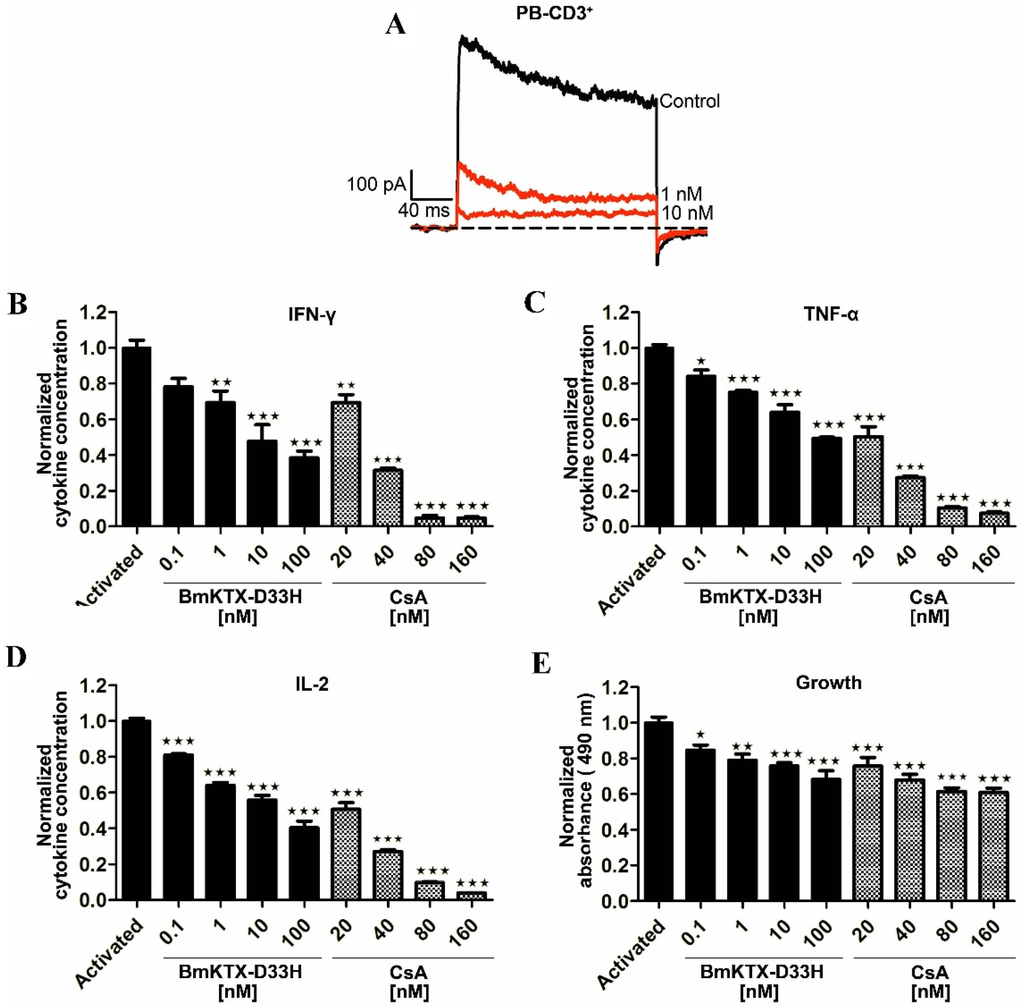 Pharmacological activities of BmKTX-D33H on Kv1.3 channels and immunomodulation in the primary human CD3+ T cells. (A) 63.3% ± 2.9% and 90.7% ± 2.1% of elicited Kv1.3 currents were inhibited by 1 and 10 nM BmKTX-D33H, respectively. Data represent the means ± S.E. of at least three experiments; (B–E) Suppression of cytokine production and in vitro proliferation of human CD3+ T cells induced by anti-CD3/CD28 beads in the presence of BmKTX-D33H or CsA, respectively. *** p < 0.001, ** p < 0.01, * p < 0.05.