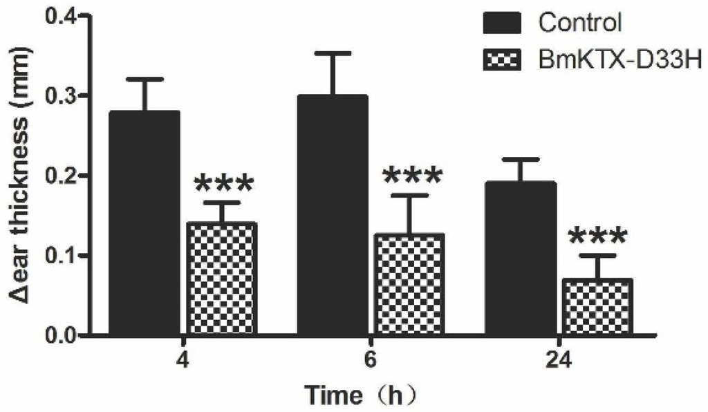 The animal trial was approved by the Animal Use and Care Committee of the Wuhan University. Female Lewis rats (9–10 weeks of age) were purchased from Charles River Laboratories and housed under pathogen-free conditions. Active DTH was induced as describe previously by immunizing rats against antigen of ovalbumin (Sigma-Aldrich, Munich, Germany) emulsified with complete Freund’s adjuvant (Sigma-Aldrich, Munich, Germany) [37]. The emulsion was injected subcutaneously into Lewis rats in order to prime the immune system and develop memory T cells. Seven days later, the rats were challenged again with ovalbumin (20 μg in 20 μL of saline solution) in the pinna of one ear (challenged ear). The other side of ear received saline solution as challenge control. Rats in control group received a single subcutaneous injection of 0.5 mL vehicle (saline solution) in the scruff of the neck, at the time of second-challenge. Whereas, rats in drug-treatment group received 100 μg/kg BmKTX-D33H (in 0.5 mL vehicle) administrated using the same method. The change for thickness of ear (at 4, 6, and 24 h post-challenge) was measured as an indication of the inflammatory reaction and DTH severity.
