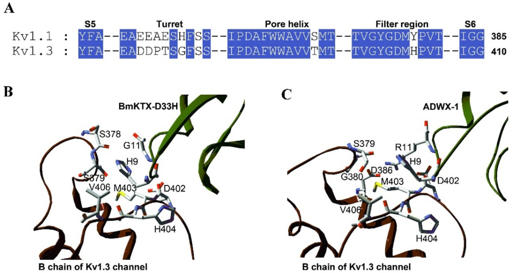 Comparison of the molecular interactions between BmKTX-D33H or ADWX-1 and the potassium channels. (A) The amino acid sequence alignment between Kv1.1 and Kv1.3 channel pore regions; (B) Interaction details of His9 and Gly11 residues in BmKTX-D33H with the Kv1.3 channel amino acid residues, within a contact distance of 5 Å. BmKTX-D33H-Kv1.3 complex from previous work [29]; (C) Interaction details of His9 and Arg11 residues in ADWX-1 with the Kv1.3 channel amino acid residues, within a contact distance of 5 Å. ADWX-1-Kv1.3 complex from previous work [26].
