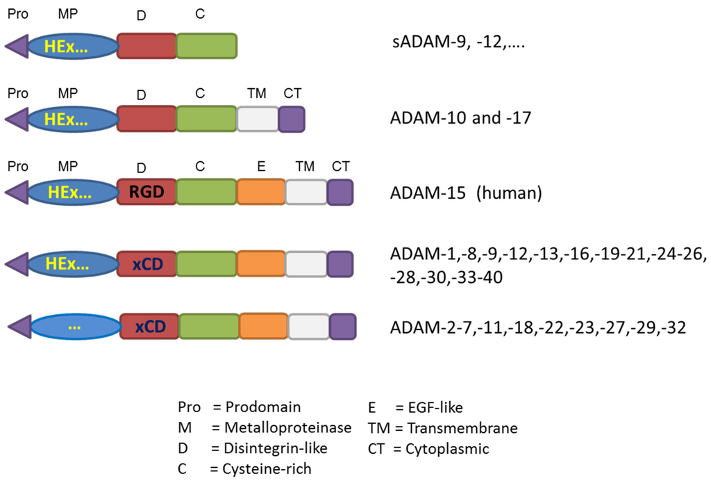 - Seals, D.F.; Courtneidge, S.A. The adams family of metalloproteases: Multidomain proteins with multiple functions. Genes Dev. 2003, 17, 7–30. [Google Scholar] [CrossRef] [PubMed]