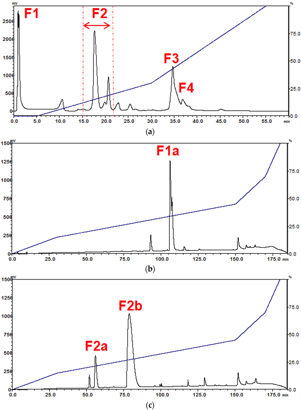 The venom of Thai Naja kaouthia (Nk-T) was resolved by cation-exchange chromatography into eight peaks, five of which constituted the majority of proteins in the venom (approximately 85% of the total peak area of the chromatogram) (Figure 1a). The five major peaks were assigned as fractions F1, F2, F3, and F4 as indicated in Figure 1a. Fractions F1–F4 were collected accordingly and were further fractionated individually by RP-HPLC over 180 min (Figure 1b–e). Fraction F1 contained acidic proteins unbound by the cation-exchange column. It was resolved into one major peak (F1a) at 105 min of reverse-phase high performance liquid chromatography (RP-HPLC). Fraction F2, the most abundant fraction comprising >35% of the total peak area of Resource S chromatogram, was separated by RP-HPLC into two main fractions (F2a and F2b) eluted at 55 min and 75 min, respectively. On cation-exchange HPLC, more basic proteins were collected in fractions F3 and F4. Although the separation of F3 and F4 appeared to be less distinctive, RP-HPLC successfully resolved each of these into one major peak, labeled as F3a (eluted at 100 min) and F4a (eluted at 120 min), respectively.