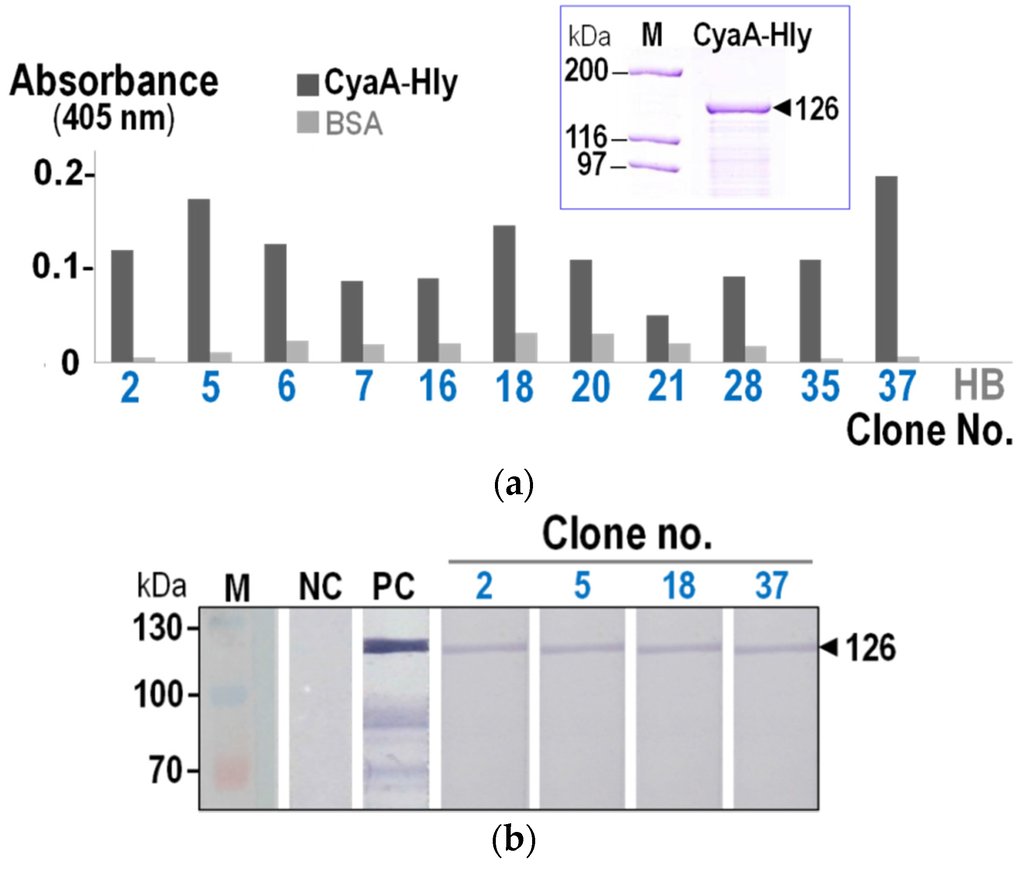 3.4. Binding Analysis of CyaA-Hly-Specific VH/VHH Nanobodies via Western Blotting