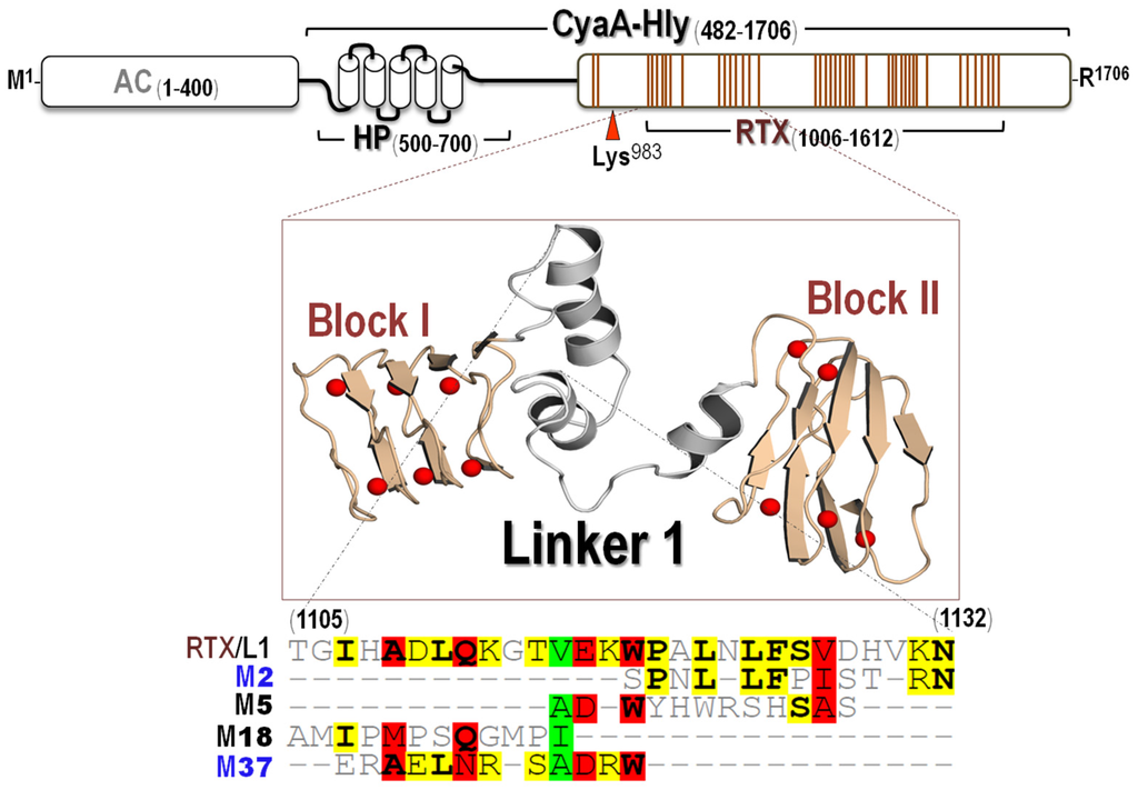 Schematic diagram of CyaA showing adenylate cyclase (AC) and hemolysin (Hly) domains. Five putative helices in the HP region (residues 500–700) are represented by blocks. Palmitoylation site is indicated by Lys983. Ca2+-binding regions in the RTX subdomain are denoted by multiple lines, each of which corresponds to a single-nonapeptide repeat (Gly-Gly-X-Gly-X-Asp-X-Leu-X). 3D-model of the first two RTX blocks (Blocks I and II) with Linker 1 is shown. Red balls represent Ca2+ ions. Multiple sequence alignments of the deduced amino acid sequences of four phage-mimotope peptides (M2, M5, M18 and M37) with sequence of CyaA-RTX/Linker 1 (RTX/L1) are presented. Amino acids are bolded to denote their identity. Degree of conservation among the sequences is highlighted by shading residues with green, red and yellow for 80%, 60% and 40% homology, respectively.
