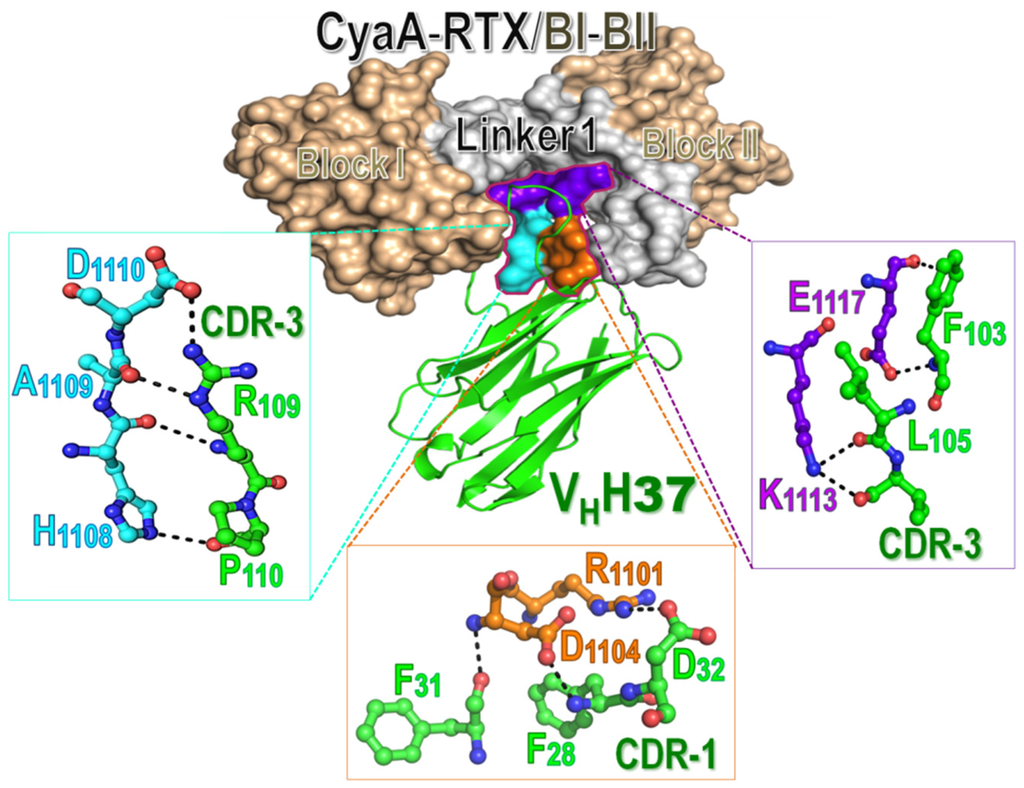 Molecular interactions between the CyaA-RTX/BI-II segment (surface representation, Blocks I and II colored in wheat and Linker 1 in gray) and VHH37 (green schematic ribbon) which illustrates a protrusion of CDR loops for interacting with the toxin. Zoomed regions show interactions of potential side-chains (ball-and-stick) of VHH37 with three spatially juxtaposed areas of the CyaA-RTX/BI-II segment (surface representations colored in cyan, orange and purple) via hydrogen and ionic bonds (dotted lines).