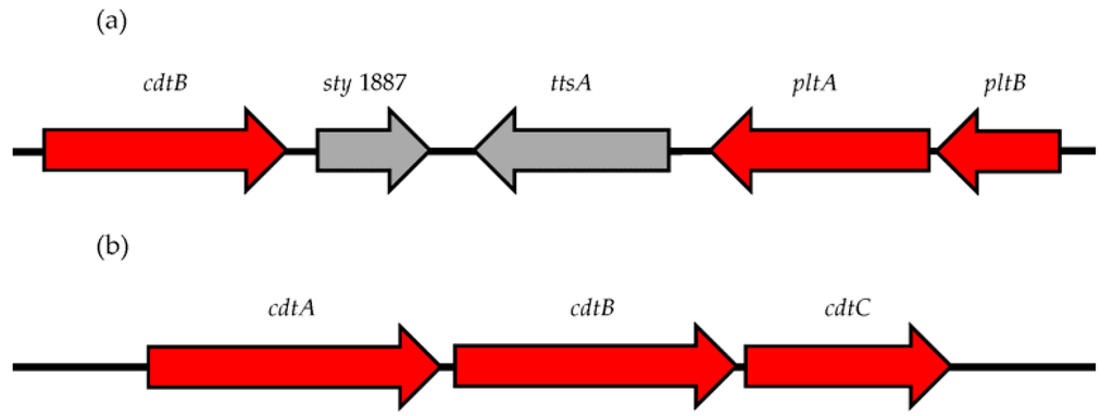 Comparison of the CdtB-islet encoded by: (a) Salmonella enterica serotypes; and (b) all other Gram-negative species producing a cytolethal distending toxin (CDT). (a) The Salmonella CDT (S-CDT) is comprised of subunits PltA, PltB, and CdtB encoded by pltA, pltB, and cdtB, respectively. The CdtB-islet in Salmonella also encodes two genes (sty1887 and ttsA) which are implicated in toxin secretion but are not subunits of S-CDT [39,42]. (b) Genes cdtA, cdtB, and cdtC encode the CDT for Aggregatibacter actinomycetemcomitans, Campylobacter spp., Escherichia coli, Haemophilus spp., Helicobacter spp., Providencia alcalifaciens, Shigella spp., and Yersinia spp. Genes colored red compose the CDT and S-CDT; genes shown in gray are present in the CdtB-islet of Salmonella, but do not encode subunits of the S-CDT.