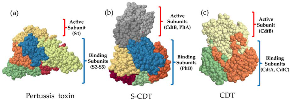 Space-fill models of the 3D structure of the: (a) pertussis toxin; (b) cytolethal distending toxin (CDT) from Salmonella enterica serotype Typhi; and (c) CDT from Haemophilus ducreyi. The unique A2B5 structure of the Salmonella cytolethal distending toxin (S-CDT) combines active subunits CdtB from the CDT produced by other Gram-negative species, and the ADP-ribosyltransferase toxin subunit of the pertussis toxin. The binding subunit of S-CDT is arranged as a pentameric ring, similar to the binding portion of the pertussis toxin. Protein databank accession numbers: Pertussis toxin (1PRT) [46], S-CDT (4K6L) [8], and CDT (1SR4) [47].