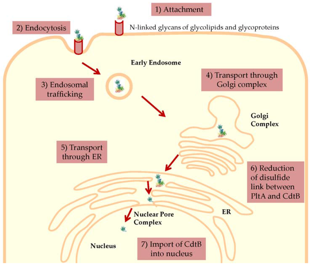 The delivery and trafficking of S-CDT differs from that of the CDT produced by other Gram-negative bacteria. The key differences distinguishing S-CDT trafficking and activation from CDTs produced by other Gram-negative bacteria include: (i) S-CDT is only produced when Salmonella cells are residing within a host eukaryotic cell; (ii) S-CDT must be exported out of the SCV and subsequently out of the host cell, after which the exported S-CDT may either re-enter the cell or intoxicate a nearby cell; (iii) S-CDT’s unique A2B5 structure (compared to the AB2 configuration of other CDTs) requires a reducing atmosphere to dissociate the PltA and CdtB subunits; and (iv) the host cell receptors for S-CDT differ as a reflection of its use of PltB rather than CdtA and CdtC subunits for binding to host cells.