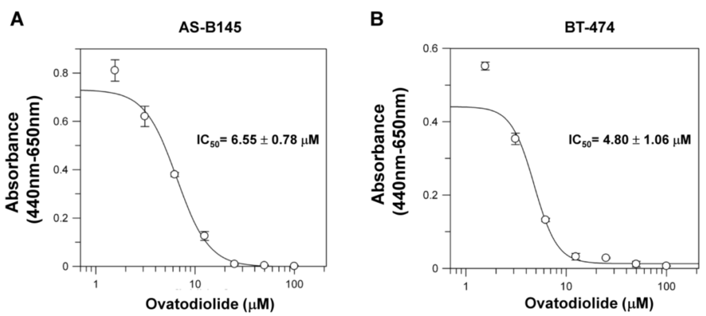 The cytotoxic effect of ovatodiolide in human breast cancer cells. AS-B145 (A) or BT-474 (B) cells were seeded in a 96-well plate and treated with a different concentration of ovatodiolide (0, 1.625, 3.125, 6.25, 12.5, 25, 50, 100 μM) for 72 h (n = 4 for each concentration). Cell proliferation was determined by WST-1 reagent and the IC50 value was calculated by GraFit software. The experiments were repeated two times and results from a representative experiment were presented.