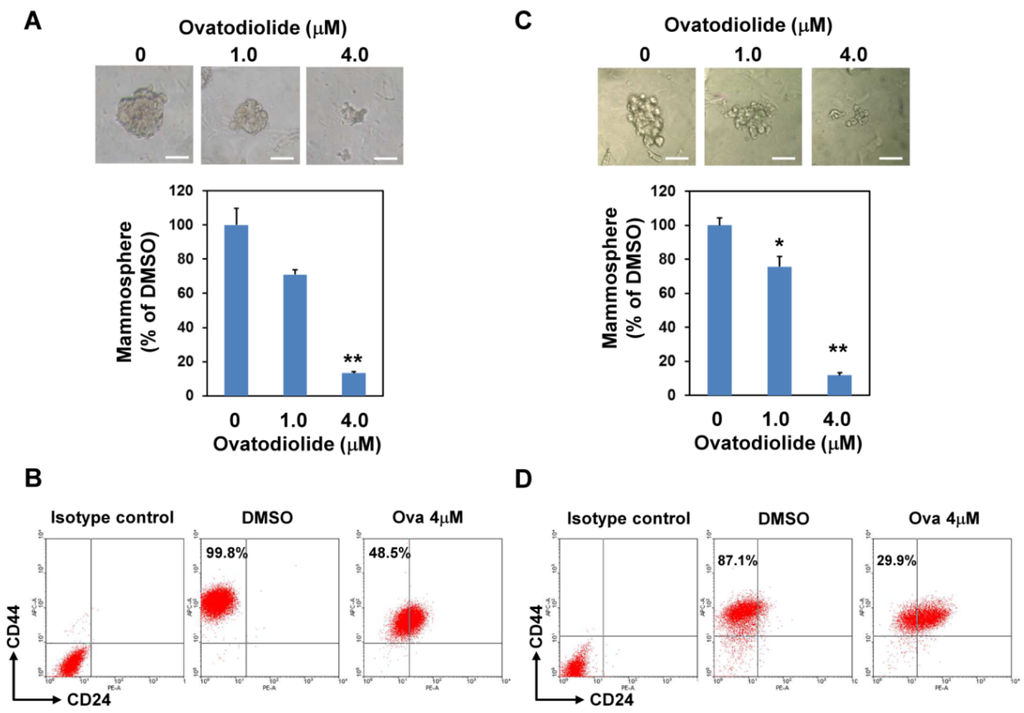 Ovatodiolide suppresses the self-renewal property of BCSCs. AS-B145 (A) or BT-474 (B) cells were seeded into ultralow attachment in a six-well plate under 0.1% DMSO or different concentrations of ovatodiolide (1 or 4 μM) for seven days and the formed primary mammospheres were collected and dissociated into a single cell suspension. The same number of dissociated primary sphere cells was used to evaluate the effect of ovatodiolide on the self-renewal property of BCSCs by secondary mammosphere formation without treatment of ovatodiolide (n = 3 for each treatment). The experiments were repeated two times and results from a representative experiment were presented. Data were presented as relative percentage of DMSO control. Scale bar = 50 μm. *, p < 0.05; **, p < 0.01. The mammosphere cells of AS-B145 (C) or BT-474 (D) were harvested and dissociated into a single-cell suspension. CD24-CD44+ cells were analyzed by flow cytometry.
