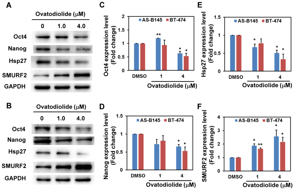 The change of protein expression in ovatodiolide-treated BCSCs. BCSCs were first enriched by primary mammosphere cultivation from AS-B145 (A) or BT-474 (B), dissociated into a single-cell suspension, and treated with different concentrations of ovatodiolide (0, 1, 4 μM) for 72 h (n = 2 for each treatment). The expressions of Oct4, Nanog, Hsp27 and SMURF2 were determined by Western blot. The quantification results of Oct4 (C), Nanog (D), Hsp27 (E) and SMURF2 (F) were determined by Image J software. The experiments were repeated three times and results from two representative experiments were used for quantifications. * p < 0.05; ** p < 0.01.