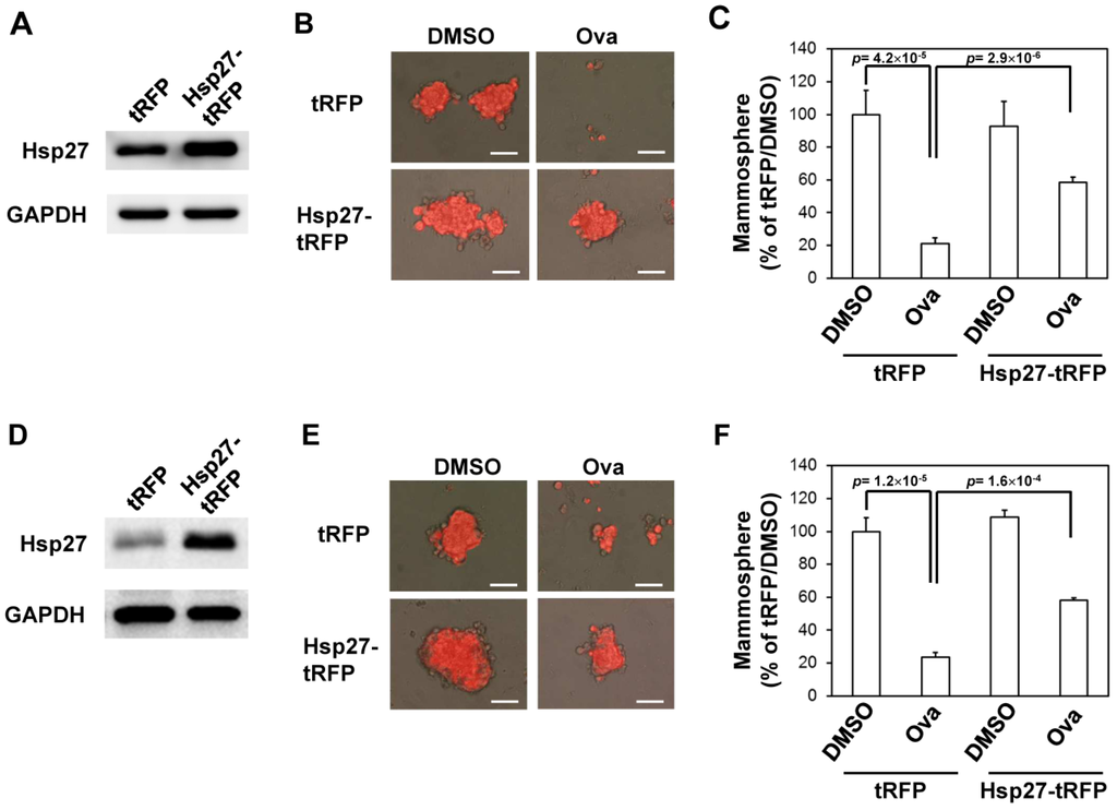 Overexpression of Hsp27 diminishes the inhibitory effect of ovatodiolide on the self-renewal capability of BCSCs. AS-B145 or BT-474 cells were transduced with tRFP or Hsp27-tRFP lentivirus and selected by 20 μg/mL blasticidin S for one week. The overexpression of Hsp27 was confirmed by Western blot ((A) for AS-B145 and (D) for BT-474). BCSCs were first enriched by primary mammosphere cultivation from tRFP- or Hsp27-overexpressed cells, dissociated into a single-cell suspension, and underwent secondary mammosphere formation under treatment with 4 μM ovatodiolide (Ova) or 0.1% DMSO (n = 3 for each treatment). Formed mammospheres were pictured ((B) for AS-B145 and (E) for BT-474) and were counted at Day 7 and displayed as the relative percentage of the DMSO group ((C) for AS-B145 and (F) for BT-474). The experiments were repeated two times and results from a representative experiment were presented. Scale bar = 50 μm.