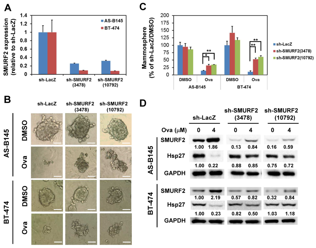 We next examined if overexpression of Hsp27 could alleviate the inhibitory effect of Ova on the mammosphere formation capability of AS-B145 cells. Overexpression of Hsp27 in AS-B145 or BT-474 cells was performed by lentivirus-mediated gene delivery and confirmed by Western blot (Figure 4A). Exogenous Hsp27 expression in AS-B145 (Figure 4B,C) or BT-474 (Figure 4D,E) significantly diminished the suppressive activity of Ova on mammosphere formation at a concentration of 4 μM (p = 2.9 × 10−6 for AS-B145 and p = 1.6 ×10−4 for BT-474). We further performed the knockdown of SMURF2 in AS-B145 or BT-474 cells by lentivirus delivery of two independent shRNA clones and both clones efficiently knocked down the mRNA expression of SMURF2 (Figure 5A). The inhibitory effect of Ova in mammosphere formation was alleviated in both sh-SMURF2 clone-transduced AS-B145 or BT-474 cells (Figure 5B,C). We also analyzed the protein expression of Hsp27 and SMURF2 in shRNA-carrying lentviruse-transduced AS-B145 or BT-474 mammosphere cells after Ova treatment. As shown in Figure 5D, these two sh-SMURF2 lentiviruses efficiently knocked down SMURF2 protein expression in AS-B145 and BT-474 mammosphere cells and alleviated the inhibitory effect of Ova in Hsp27 protein expression (Figure 5D). These results suggest the suppressive effect of Ova in the self-renewal of BCSCs through the SMURF2-mediated downregulation of Hsp27 expression.