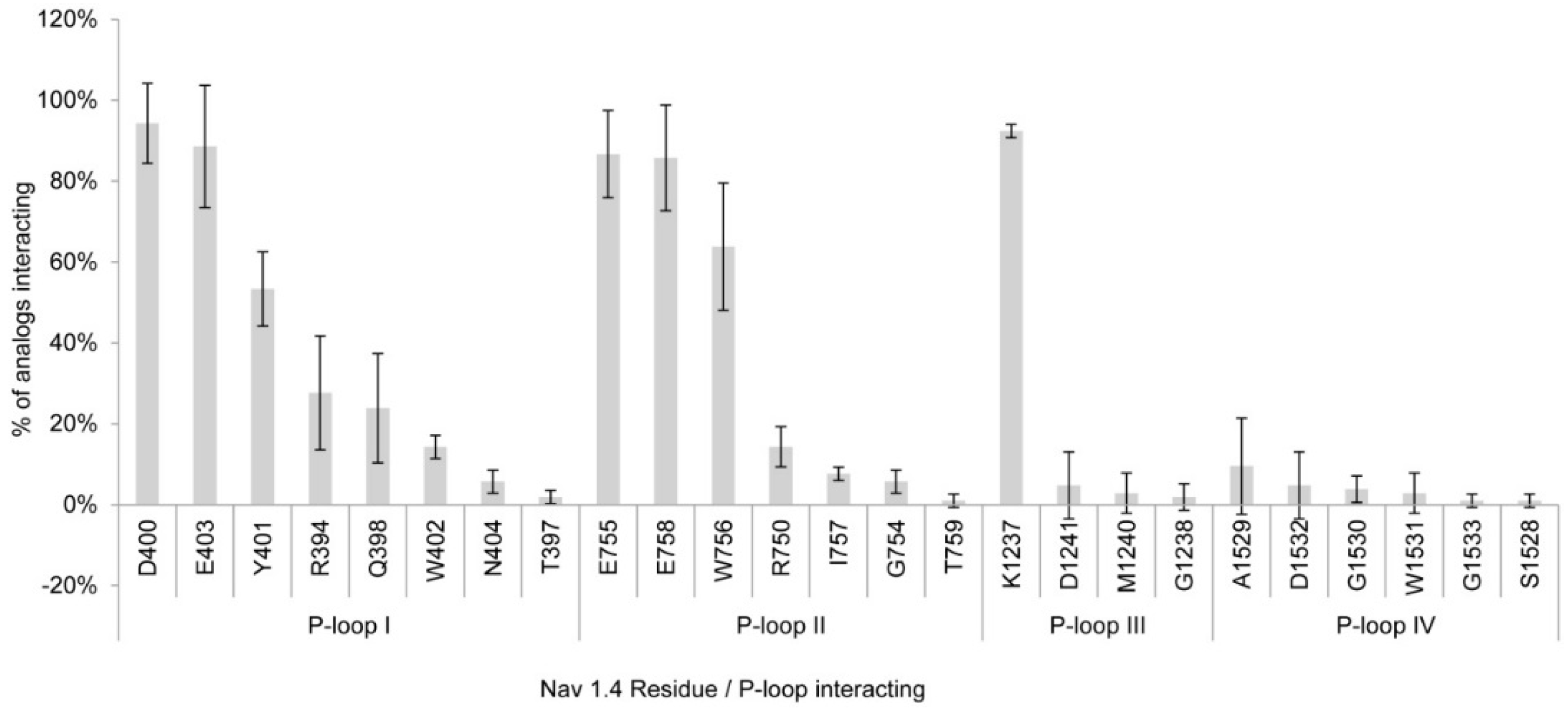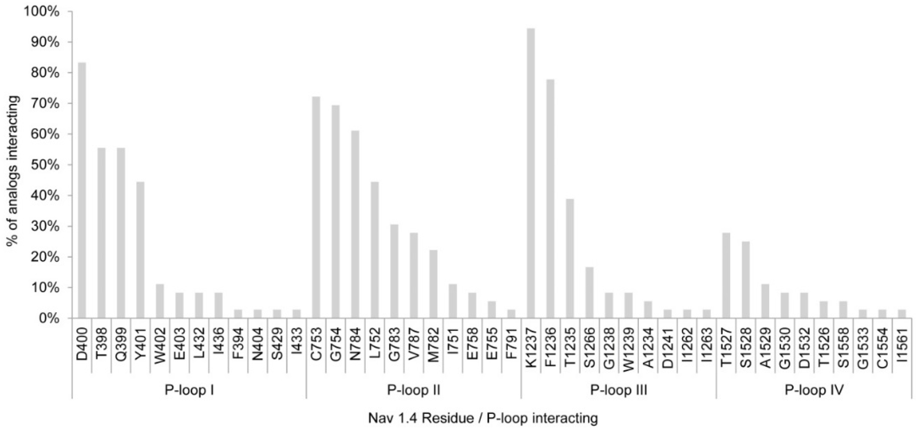 All analogs interacted with the Nav1.4 residues with both models, but to a different extent. The results of these interactions are explained for each model in the following sections.