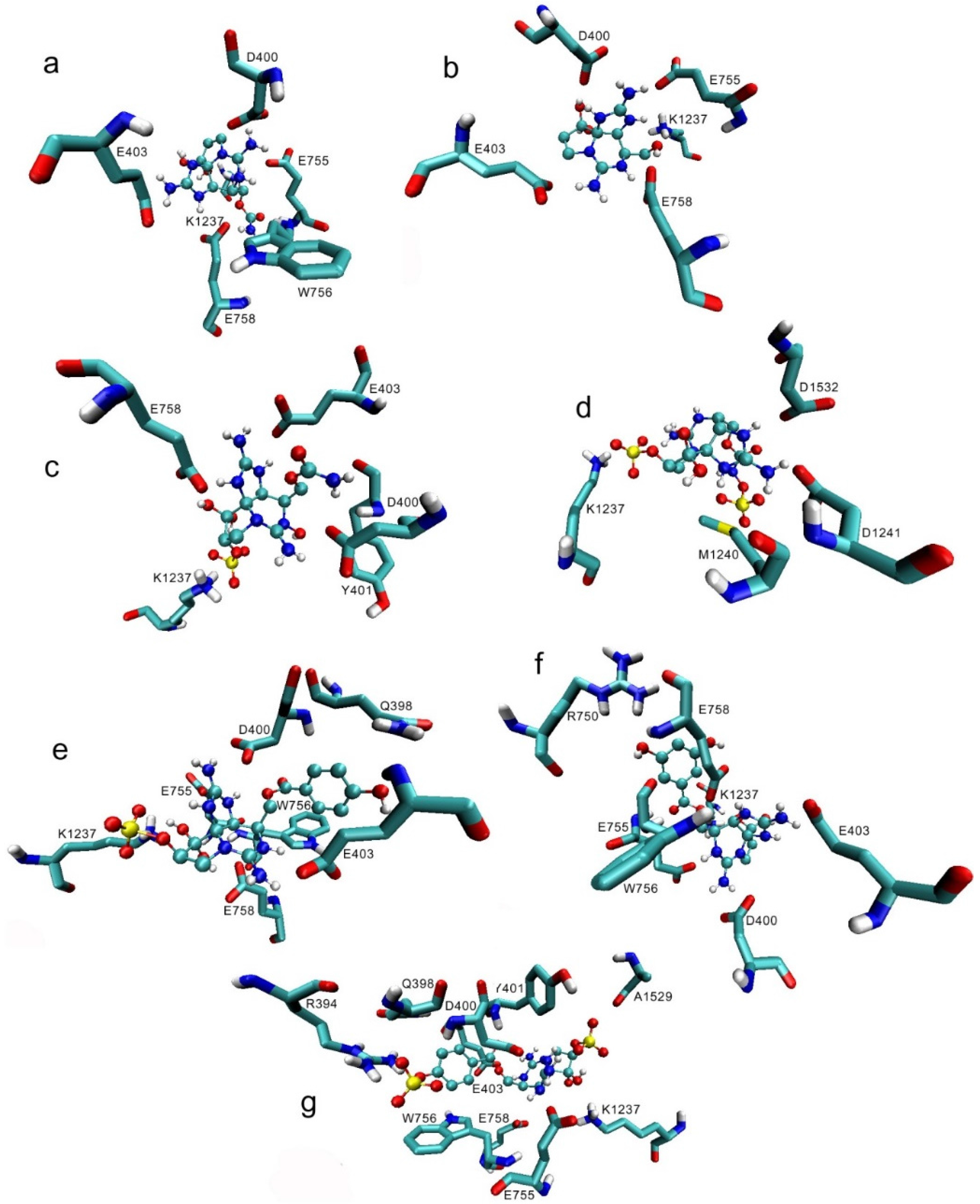 Binding of saxitoxin (STX) and some of its analogs with the residues from the Nav1.4 Model 1 according to this docking study: (a) STX; (b) decarbamoyl saxitoxin (dcSTX); (c) gonyautoxin (GTX4); (d) C2 toxin (C2); (e) p-hydroxybenzoyl (GC1); (f) di-hydroxybenzoyl (GC3a); and (g) sulfobenzoyl (GC1b) toxins. Spheres = toxins; sticks = Nav residues. These toxins represent those that have the lowest ΔG values per family of toxins and for which the main non-bond interactions between guanidinium and E403, D400, E258, as well as between sulfate groups and K1237 and R394, are electrostatic.