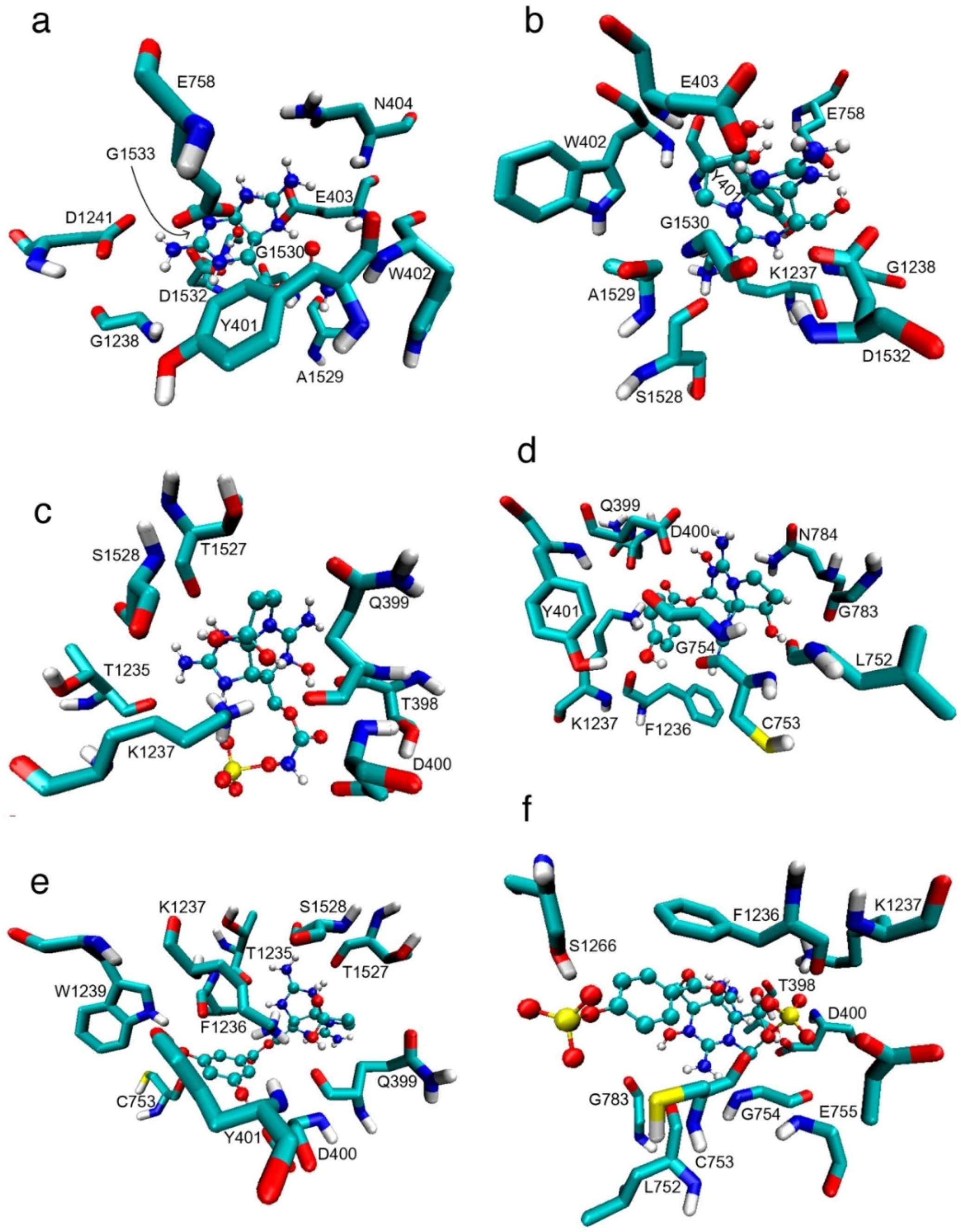 Binding of STX and some of its analogs with the residues from the Nav1.4 Model 2 according to this docking study: (a) STX; (b) decarbamoyl saxitoxin (dcSTX); (c) B toxin (B2); (d) p-hydroxybenzoyl (GC6); (e) di-hydroxybenzoyl (GC3a); and (f) sulfobenzoyl (GC5b). Spheres = toxins; sticks = Nav residues. These toxins represent those that have the lowest ΔG values per family of toxins and for which the main non-bond interactions are electrostatic, e.g., between guanidinium and E403 and D400, except for GC3a, as well as between sulfate groups and K1237, except for GC5b.