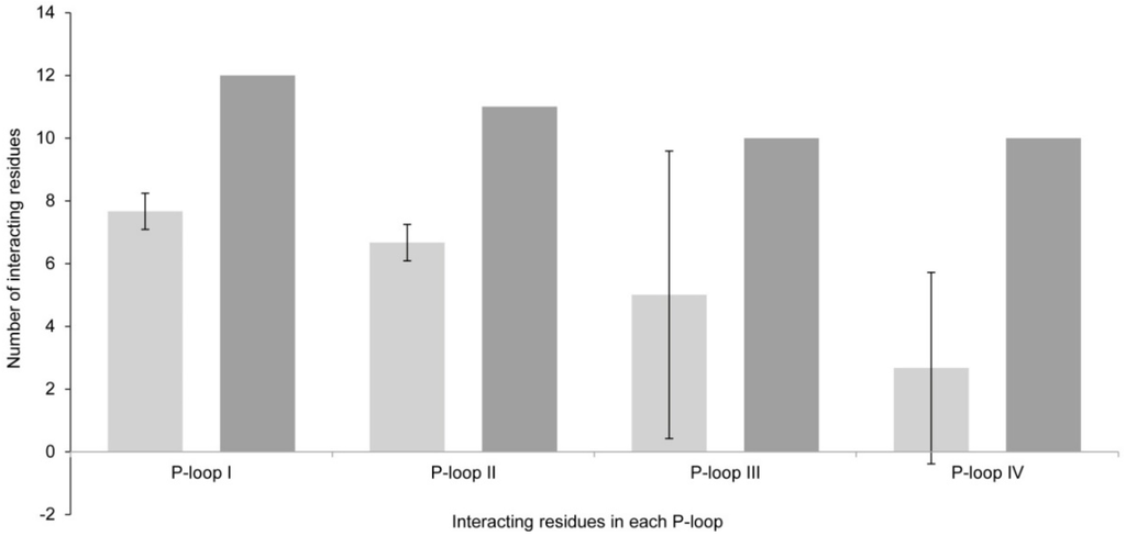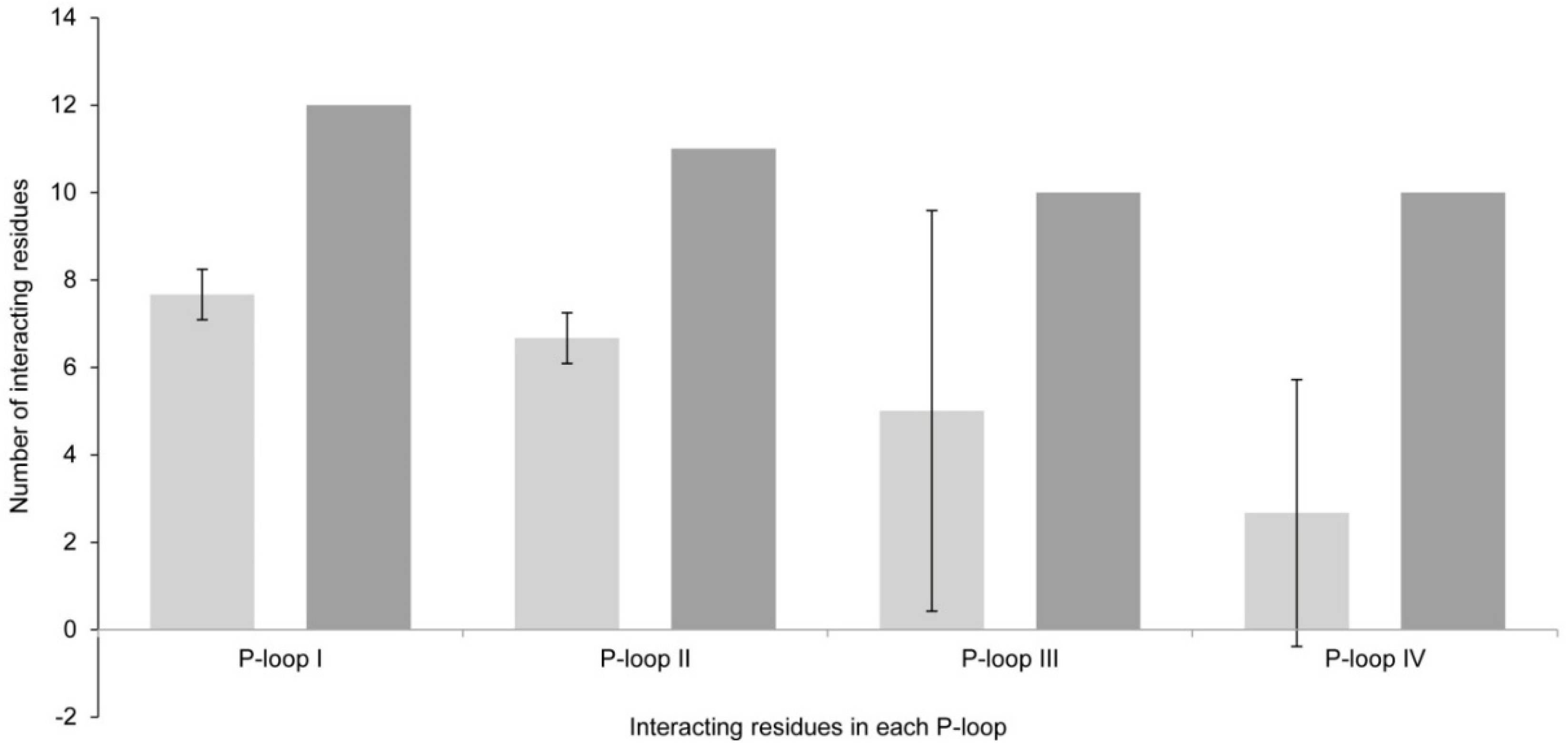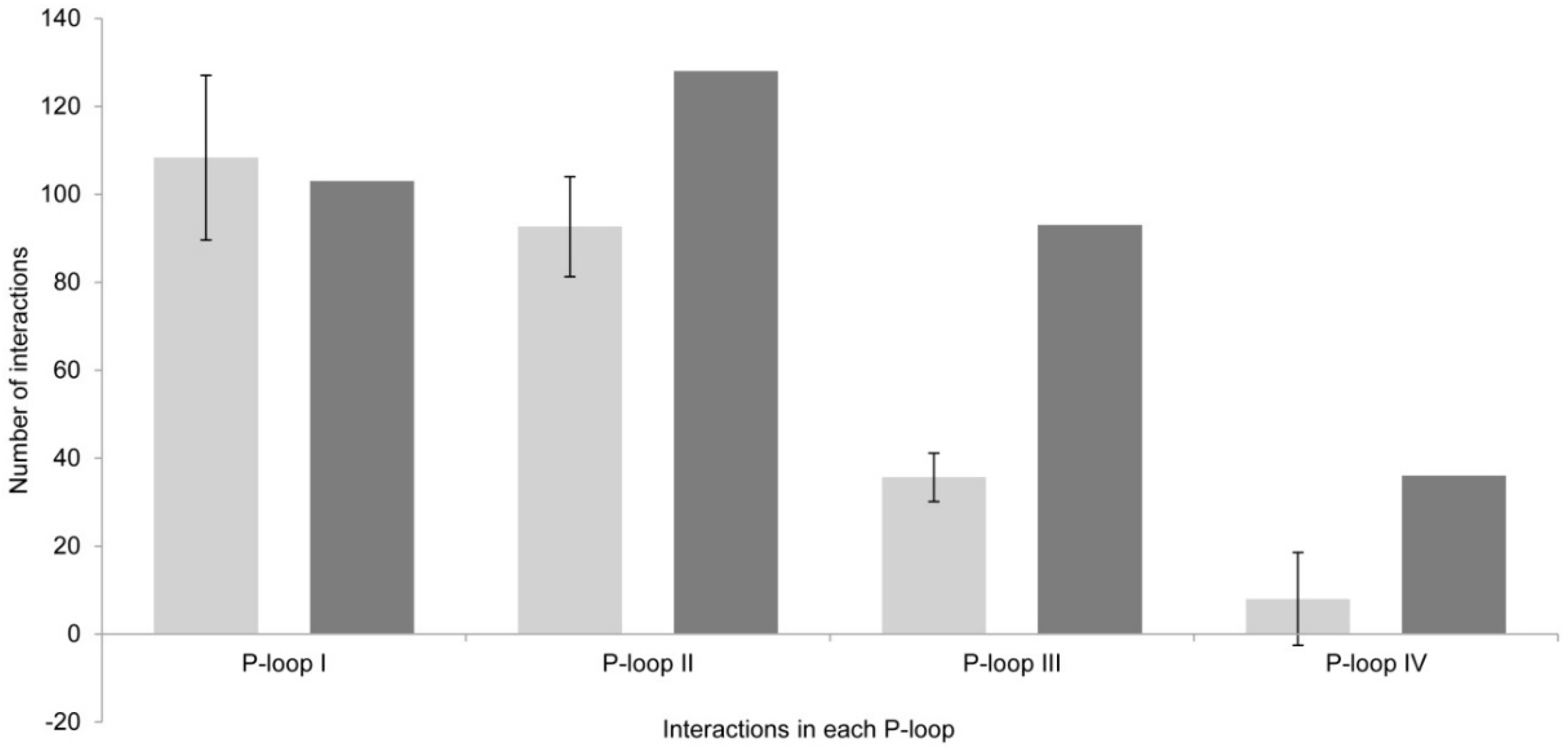Total number of interacting residues in Model 1 (light gray) versus Model 2 (dark gray) in each P-loop.