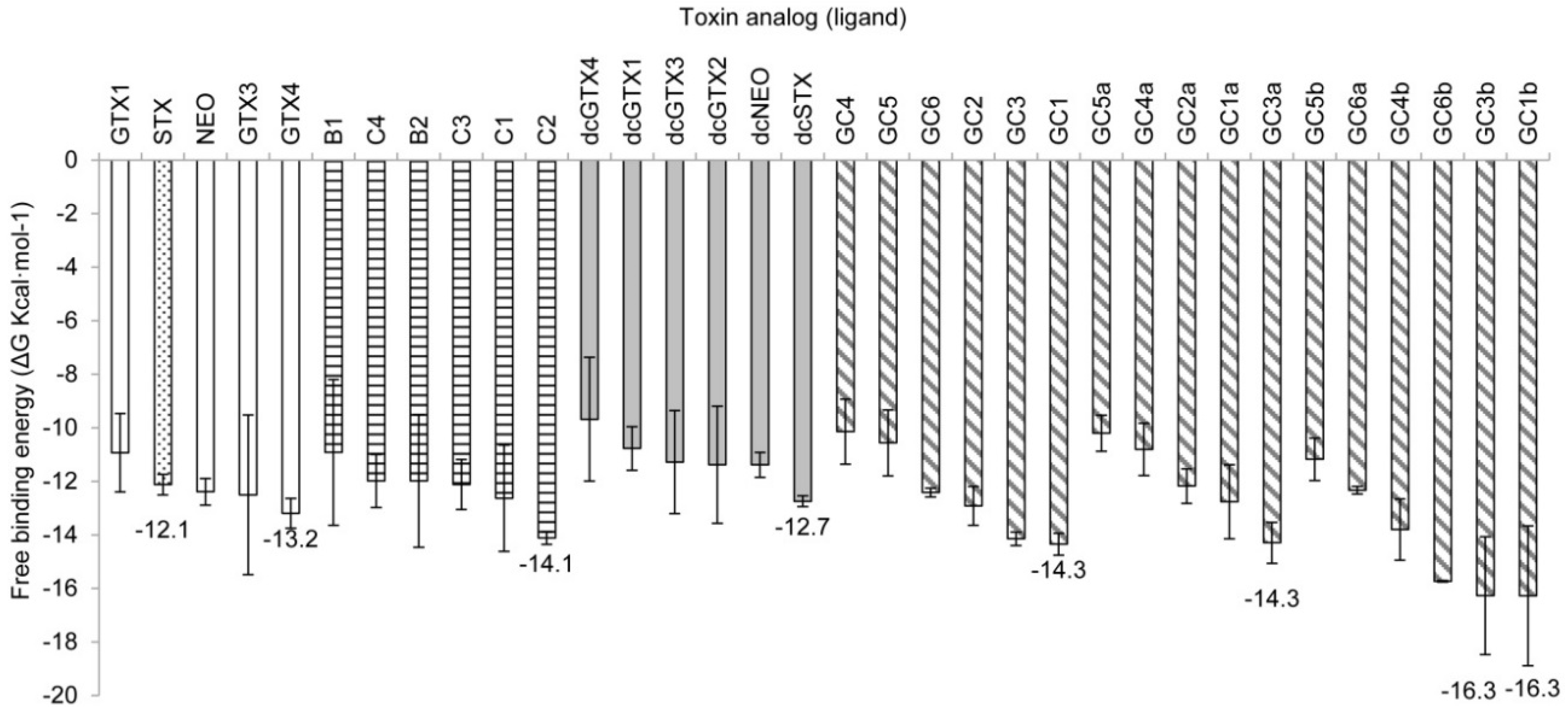 Free-binding energy (ΔG, kcal·mol−1) of the docked toxins with Model 1. Toxins are grouped according to their lateral chain: empty bars, carbamoyl toxins; horizontal hatching, N-sulfocarbamoyl toxins; gray bars, decarbamoyl toxins; diagonal hatching, benzoyl toxins. The most potent PST, STX, is shown in the dotted bar. Numbers indicate the lowest ΔG in each group compared with that of STX.