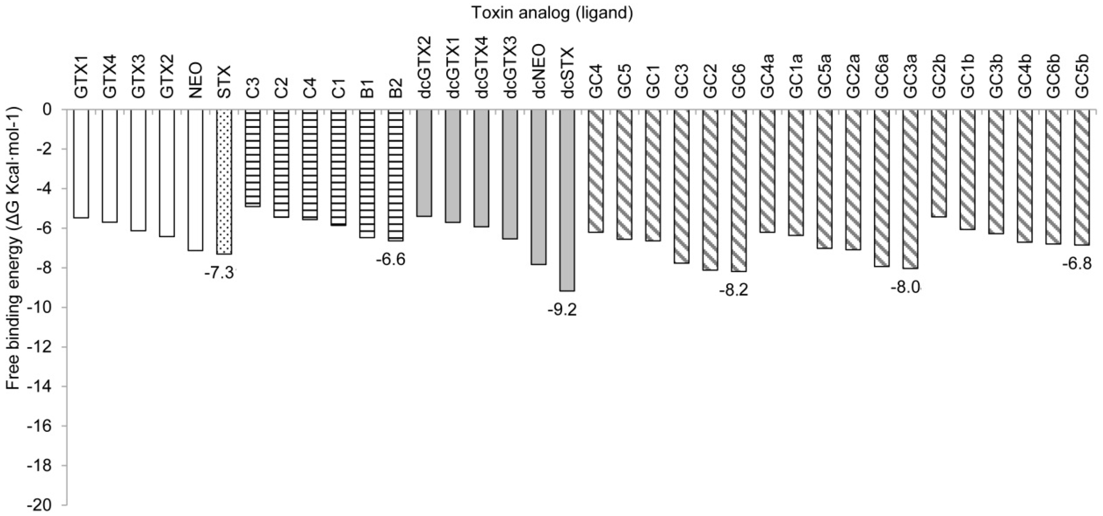 Free-binding energy (ΔG, kcal·mol−1) of the docked toxins with Model 2. Toxins are grouped according to their lateral chain: empty bars, carbamoyl toxins; horizontal hatching, N-sulfocarbamoyl toxins; gray bars, decarbamoyl toxins; diagonal hatching, benzoyl toxins. The most potent PST, saxitoxin (STX), is shown in the dotted bar. Numbers indicate the lowest ΔG in each group compared with that of STX.