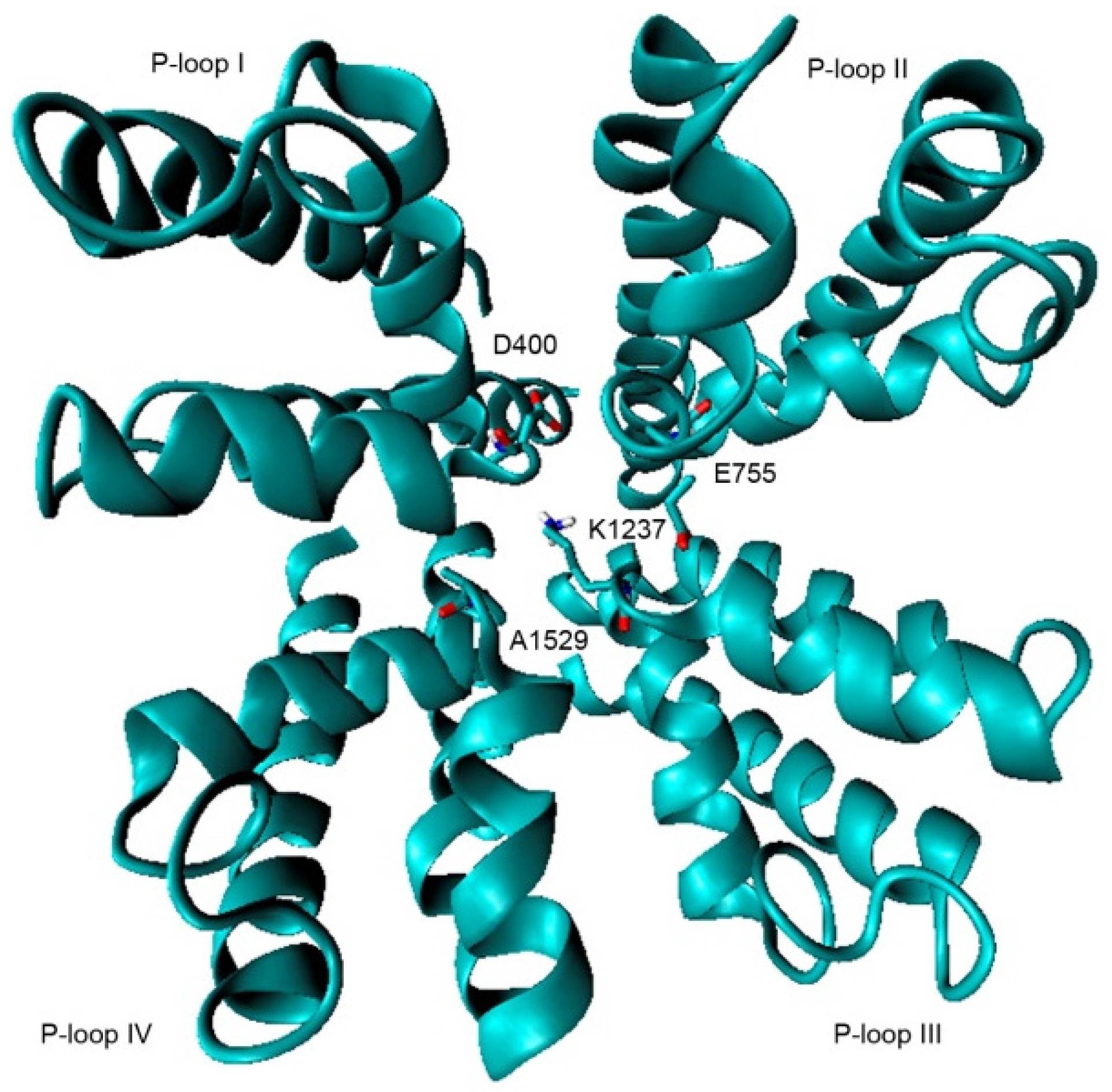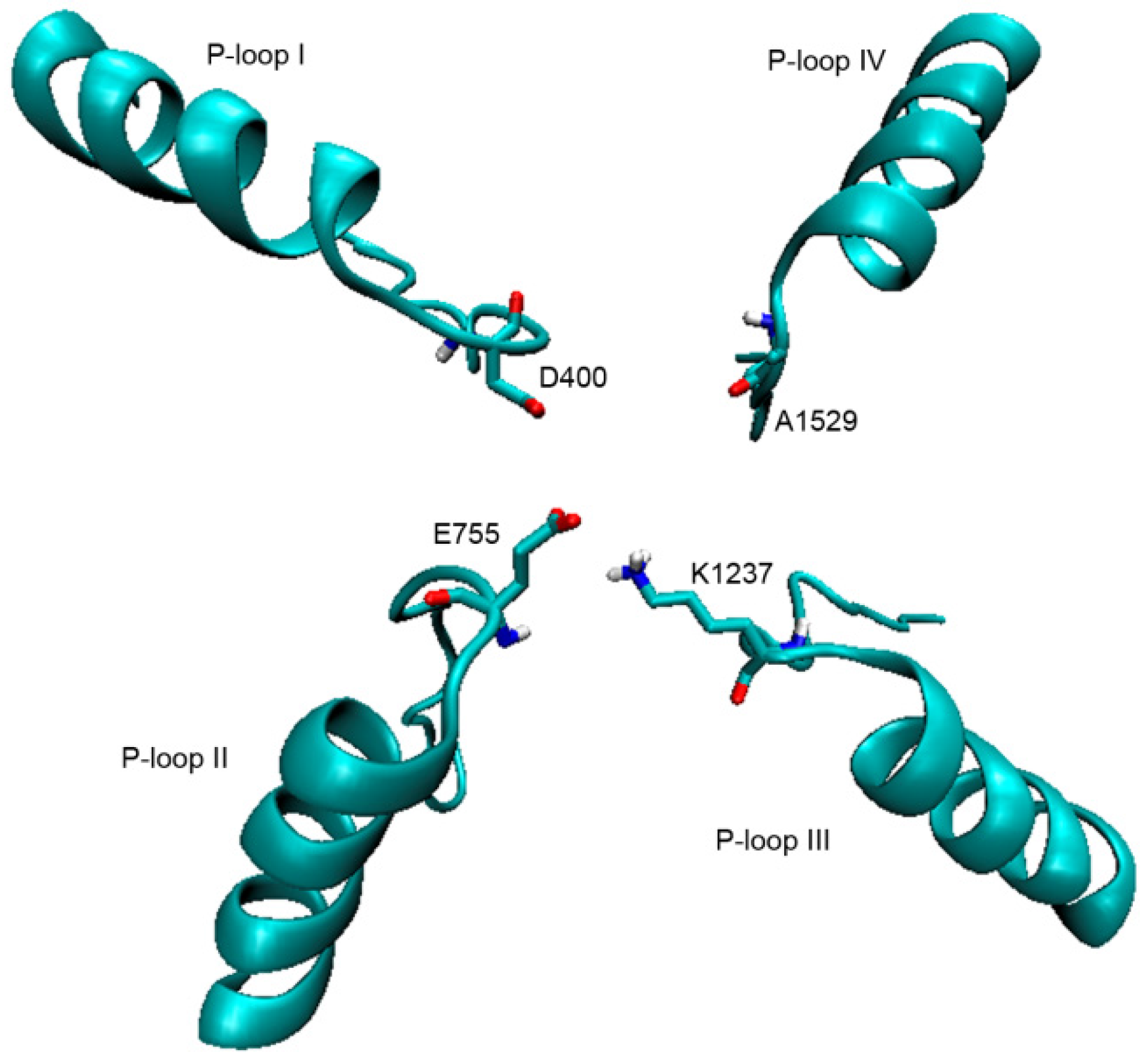 Model 1; P-loops from domains I–IV. The DEKA motif residues are drawn in sticks.
