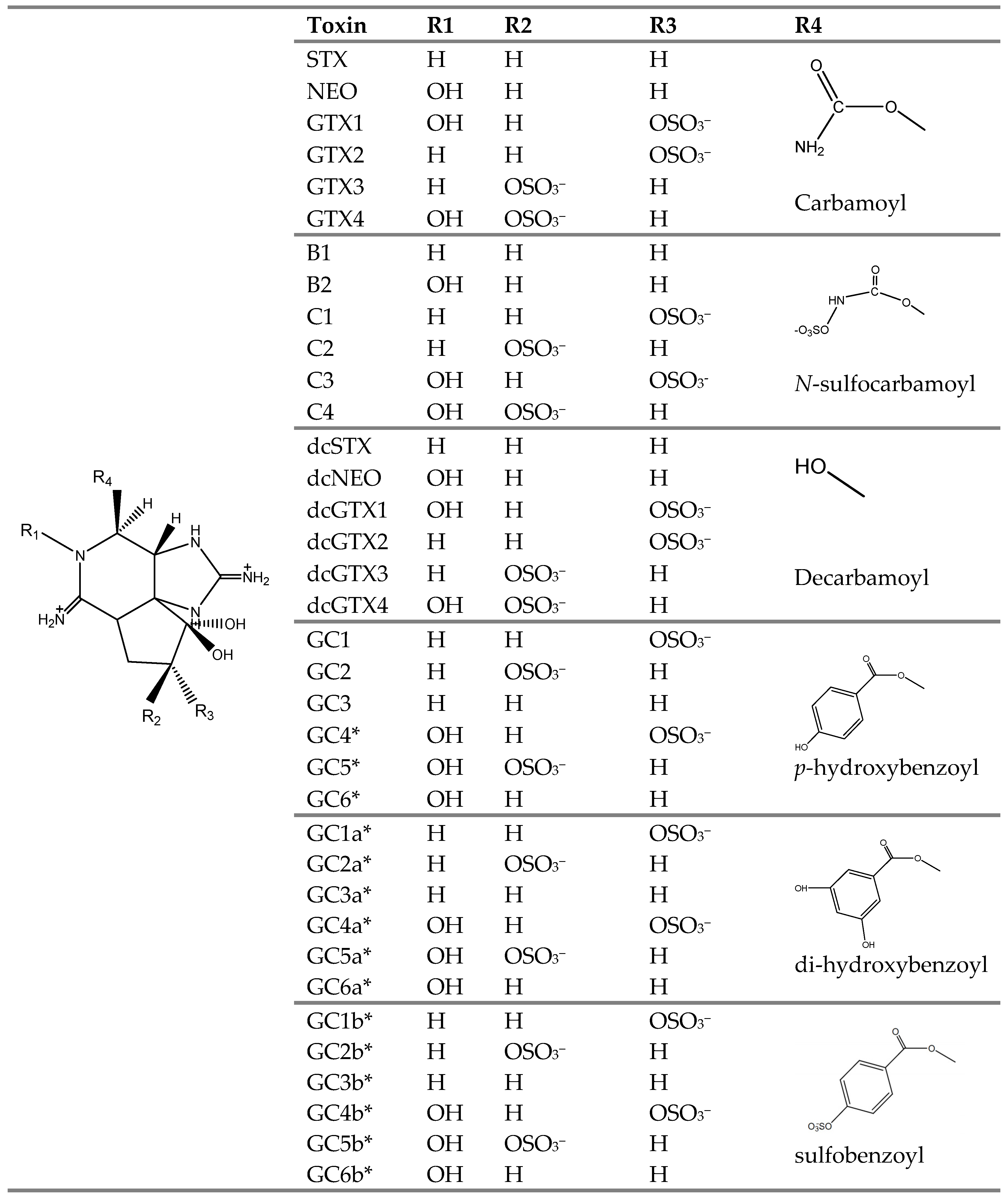 - Vale, P. New saxitoxin analogues in the marine environment: Developments in toxin chemistry, detection and biotransformation during the 2000s. Phytochem. Rev. 2010, 9, 525–535. [Google Scholar] [CrossRef]