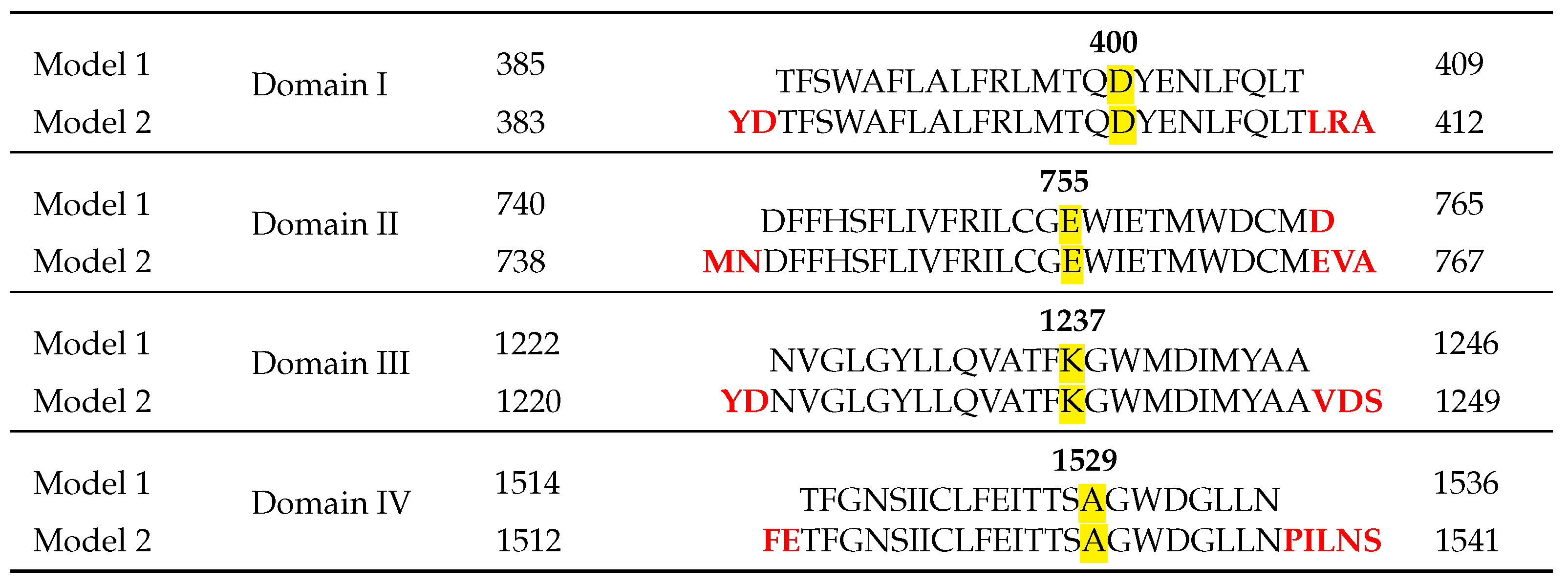 Alignments of P-loops from domains I–IV used for each model. Differences between the two models are noted in red. The DEKA residues in the four domains forming the selectivity filter are highlighted. Modified from [,].