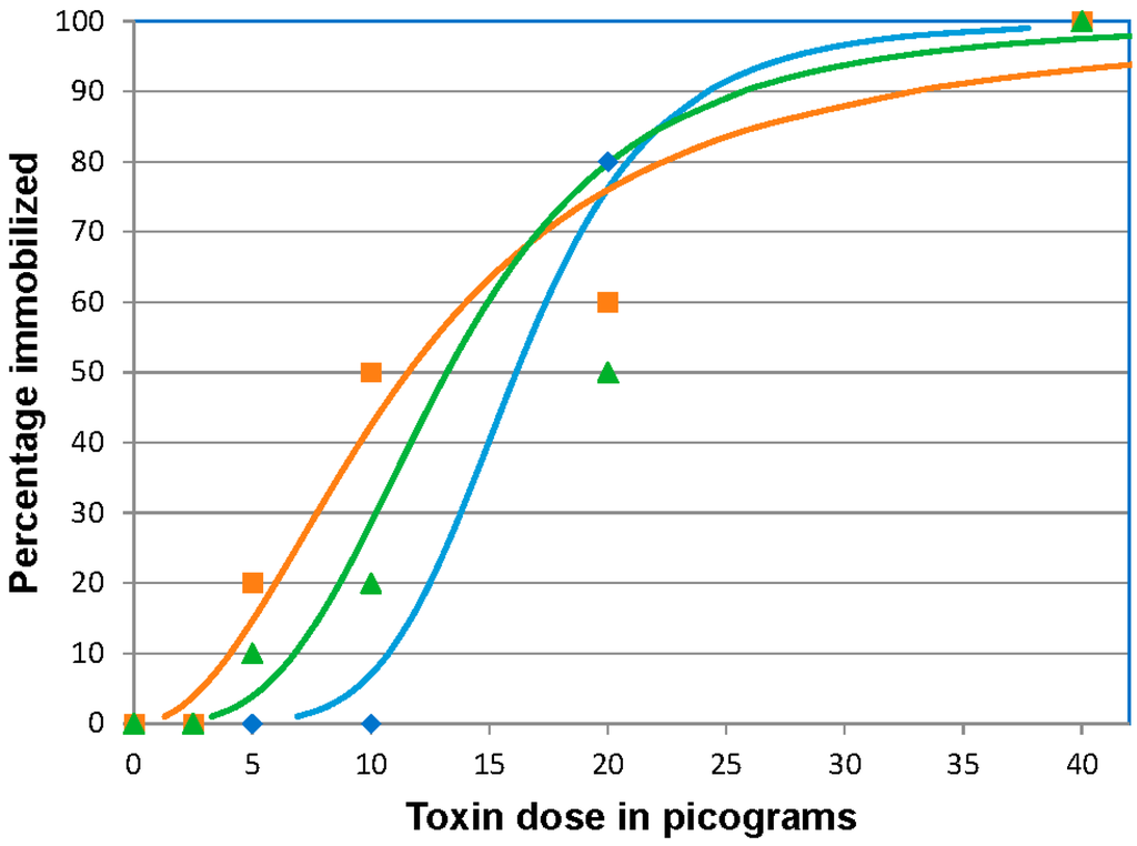 Botulinum neurotoxin E (BoNT/E) 96 h immobilizing dose response curves for zebrafish. Fish were injected intracoelomically with 10 µL containing 10, 5, 2.5, 1.25, or 0.62 pg BoNT/E activated with trypsin in gelatin phosphate buffer (n = 10 fish/treatment/replicate). The results of three replicates are shown. The actual percentage immobilized for each dosage in each replicate is indicated by the symbol corresponding to the calculated curve of the same color. Blue curve and diamonds, orange curve and squares and green curve and triangles represent data from replicates 1, 2 and 3 respectively.