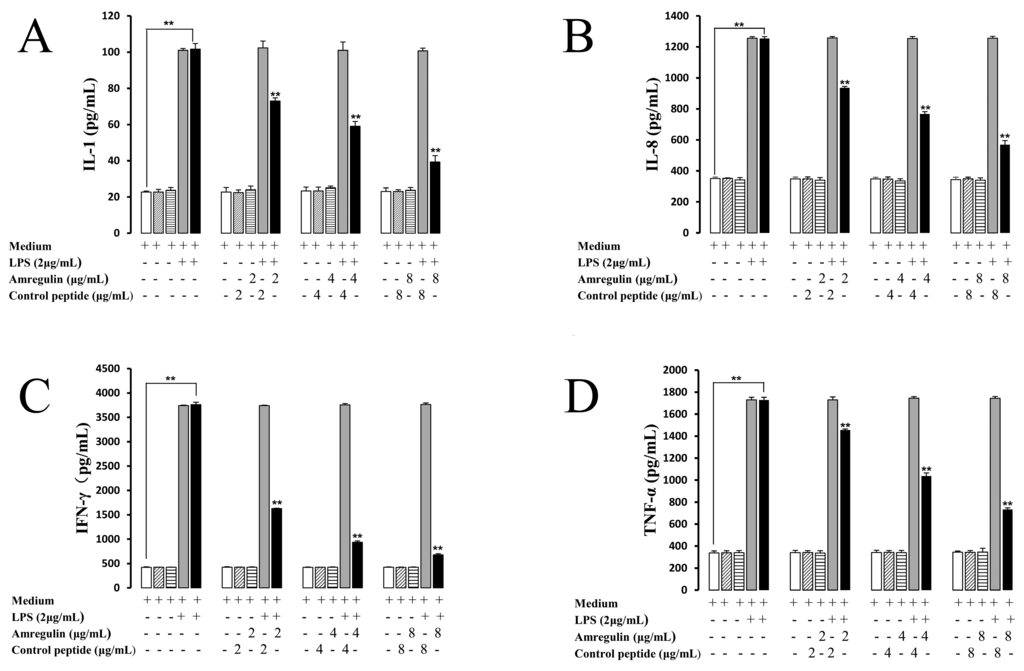 3.1. Effects of Amregulin on Cytokine Secretion Induced by LPS