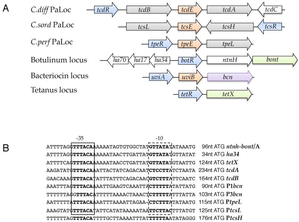 - Dupuy, B.; Matamouros, S. Regulation of toxin and bacteriocin synthesis in Clostridium species by a new subgroup of RNA polymerase sigma-factors. Res. Microbiol. 2006, 157, 201–205. [Google Scholar] [CrossRef] [PubMed]