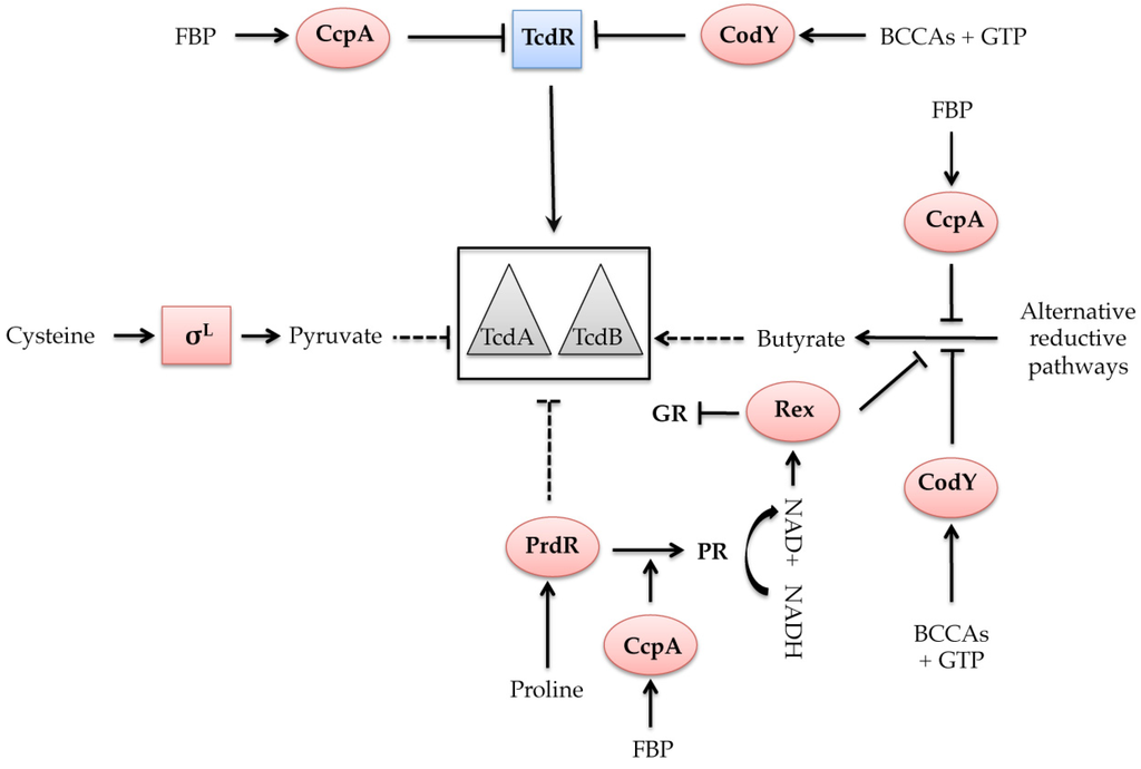 - Antunes, A.; Camiade, E.; Monot, M.; Courtois, E.; Barbut, F.; Sernova, N.V.; Rodionov, D.A.; Martin-Verstraete, I.; Dupuy, B. Global transcriptional control by glucose and carbon regulator CcpA in Clostridium difficile. Nucleic Acids Res. 2012, 40, 10701–10718. [Google Scholar] [CrossRef] [PubMed]
