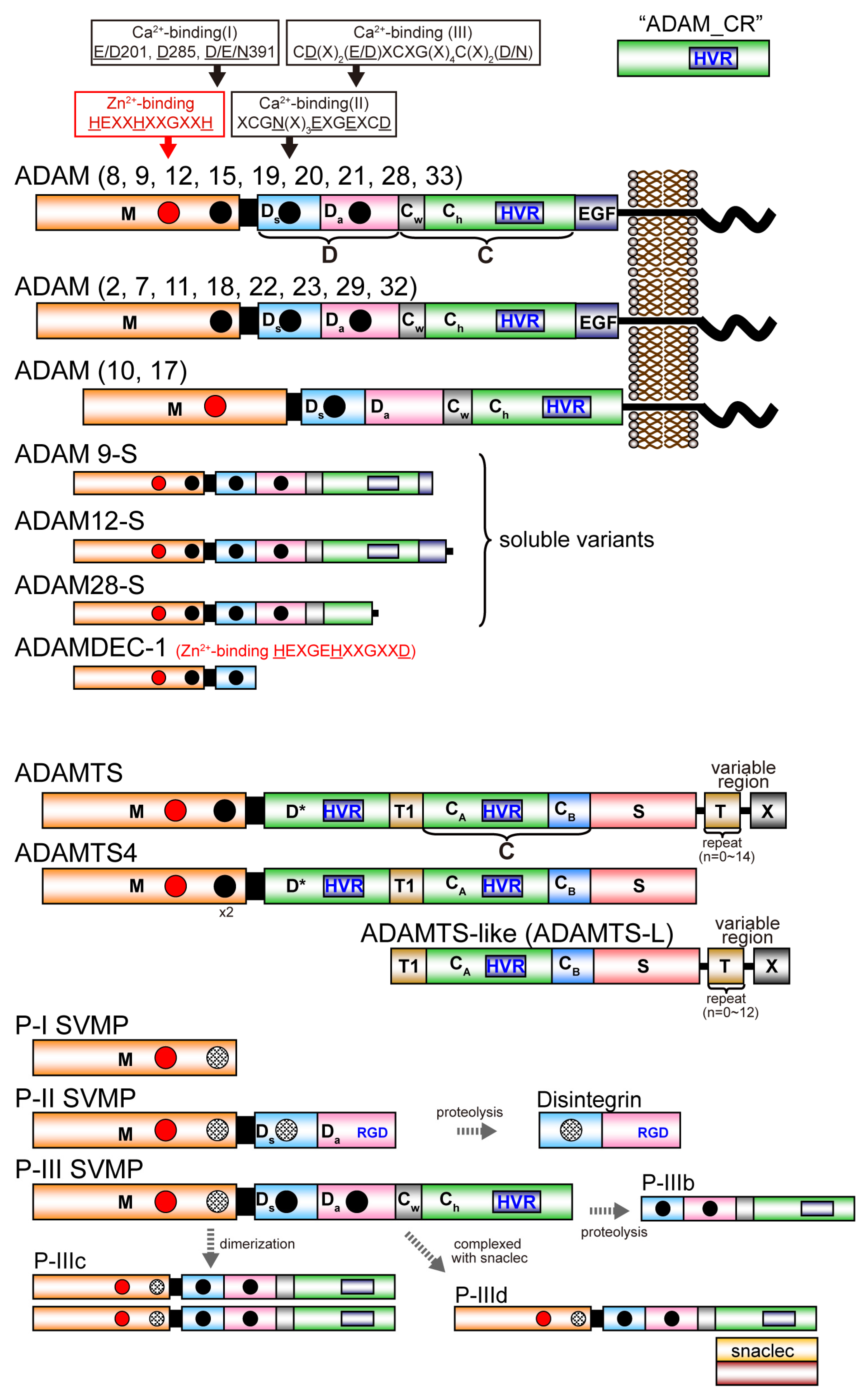 Crystallographic studies on the D* domain-containing fragments of ADAMTS1, 4, 5 and 13 revealed that the D* domain of ADAMTSs has no structural similarity to classic snake disintegrins, but is very similar in structure to the Ch subdomain of ADAMs and P-III SVMPs [44,53,66,71]. The N-terminal portion of the C domain of ADAMTSs (the CA subdomain) also possesses essentially the same fold as the Ch subdomain, even though the two share no apparent sequence similarity [53]. Thus while the “disintegrin” nomenclature has been used to describe ADAMTS family proteinases, ADAMTSs actually contain no disintegrin-like structures, but instead have two homologous domains that belongs to the ADAM_CR. Therefore, it is now obvious that the presence of the evolutionarily-conserved ADAM_CR domain, not the disintegrin domain, is another hallmark of the M12B members in addition to the catalytic M domain architecture.