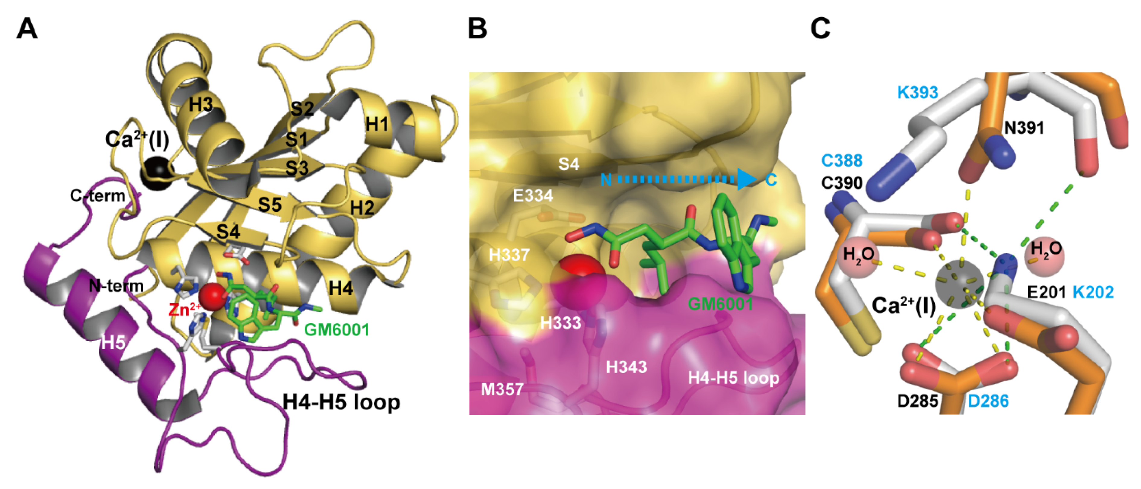 Catalytic M domain structure. (A) Structure of the M domain of catrocollastatin/VAP2B in complex with GM6001 (2DW0). The upper and lower subdomains are colored in gold and magenta respectively. (B) Close up view of the catalytic site. (C) Close up view of the Ca2+-binding site of catrocollastatin/VAP2B (shown in orange) overlaid on the corresponding region of VAP1 (shown in gray). Residues in catrocollastatin/VAP2B and VAP1 are indicated in black and cyan, respectively.