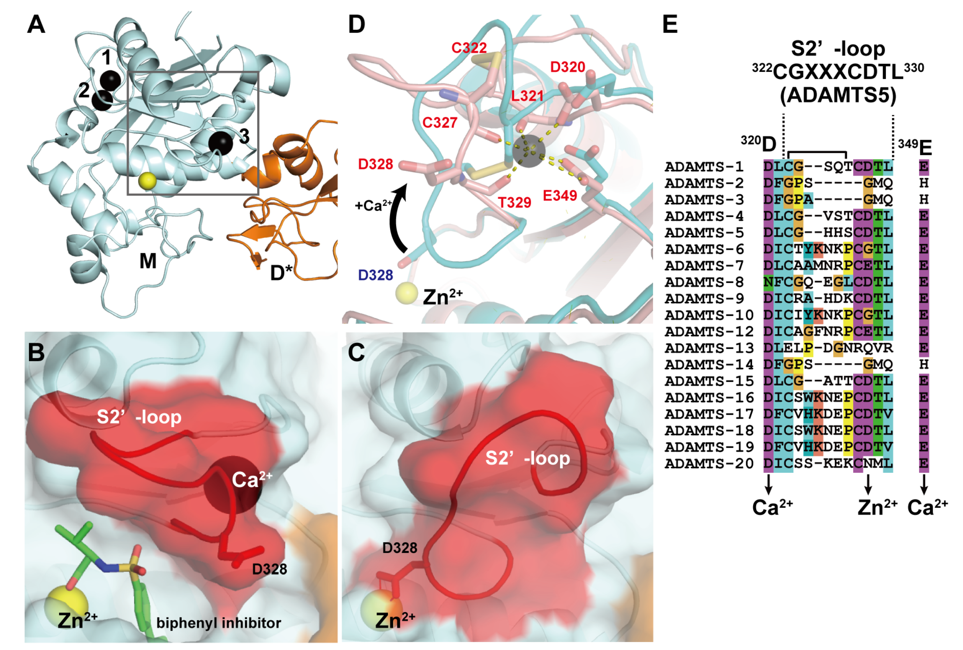 Crystal structures of ADAMTS5-MD*. (A) Overall structure of ADAMTS-MD*. Zn2+ and Ca2+ ions are shown in yellow and black spheres, respectively. Molecular surface of the active site in the inhibitor-bound “open” (B) and the apo “closed” form (C). (D) Superimposition of the two loop configurations: The closed conformation is depicted in cyan, the open conformation is shown in pink. (E) Amino acid sequence alignments of ADAMTSs around the “S2’-loop”. The Genbank IDs for each ADAMTS sequence are, ADAMTS1 (Genbank ID (GI): 50845384), ADAMTS2 (GI: 3928000), ADAMTS3 (GI: 21265037), ADAMTS4 (GI: 12643637), ADAMTS5 (GI: 12643903), ADAMTS6 (GI: 64276808), ADAMTS7 (GI: 38197242), ADAMTS8 (GI: 153792351), ADAMTS9 (GI: 33624896), ADAMTS10 (GI: 56121815), ADAMTS12 (GI: 51558724), ADAMTS13 (GI: 21265034), ADAMTS14 (GI: 21265052), ADAMTS15 (GI: 21265058), ADAMTS16 (GI: 32363141), ADAMTS17 (GI: 37999850), ADAMTS18 (GI: 76800647), ADAMTS19 (GI: 29336810) and ADAMTS20 (GI: 28316229).