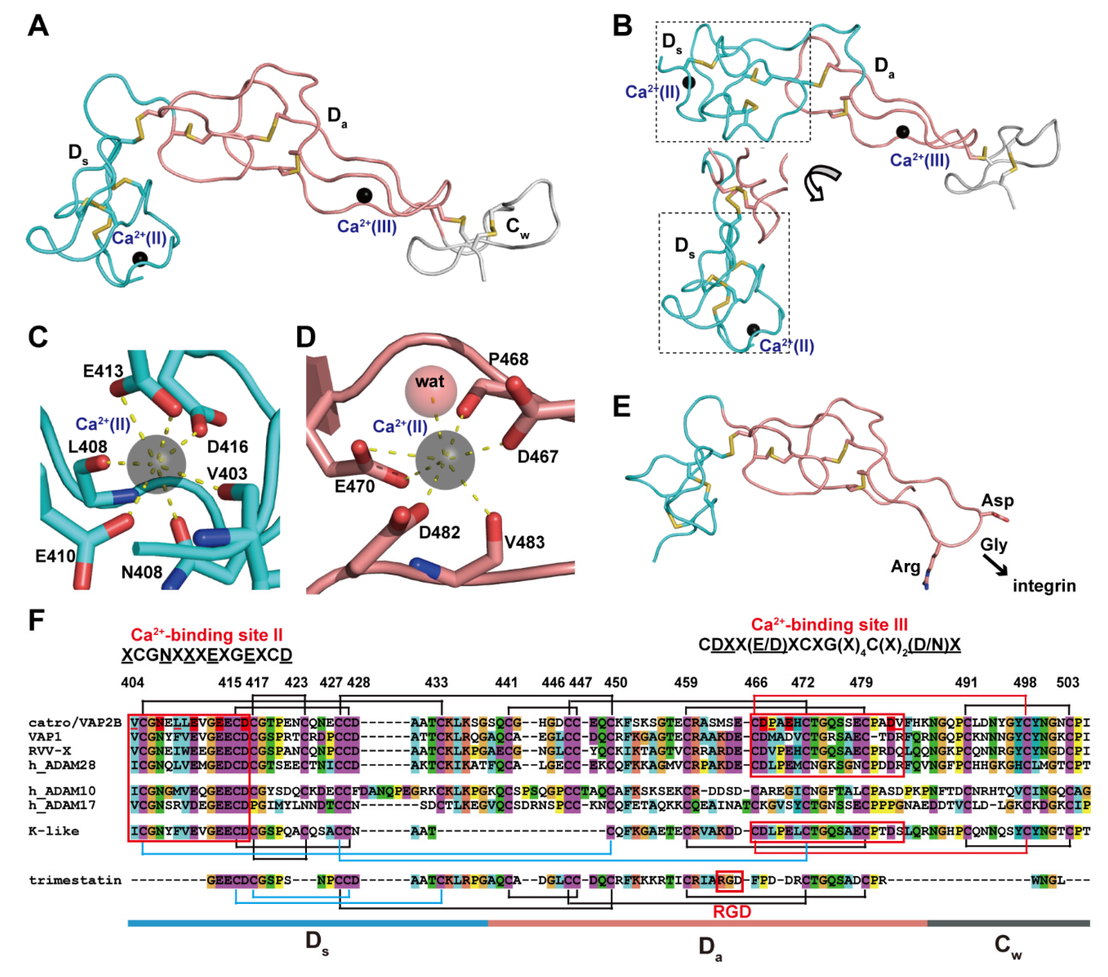 Arm structure. (A) The Ds, Da, and Cw subdomains of catrocollastatin/VAP2B (2DW0) are shown in cyan, pink, and gray, respectively. (B) The D domain of K-like proteinase (3K7N) with two different views of the Ds subdomain (in dotted line boxes). Close up views of the Ca2+-binding sites, II (C) and III (D) in catrocollastatin/VAP2B. (E) Structure of an RGD-containing disintegrin, trimestatin (1J2L). Suggested integrin-binding residues are indicated. (F) Amino acid sequence alignment of catrocollastatin/VAP2B (PDB: 2DW0_A), VAP1 (PDB: 2ERO_A), RVV-X (PDB: 2E3X_A), human ADAM28 (Genbank ID (GI): 98985828), human ADAM10 (GI: 29337031), human ADAM17 (GI: 14423632), K-like (PDB: 3K7Y_A) and trimestatin (1J2L_A) generated using Clustal X2 (http://www.clustal.org/clustal2/). Disulfide bonds and the boundaries of the subdomains are schematically indicated. Ca2+-binding sites II and III are boxed in red.