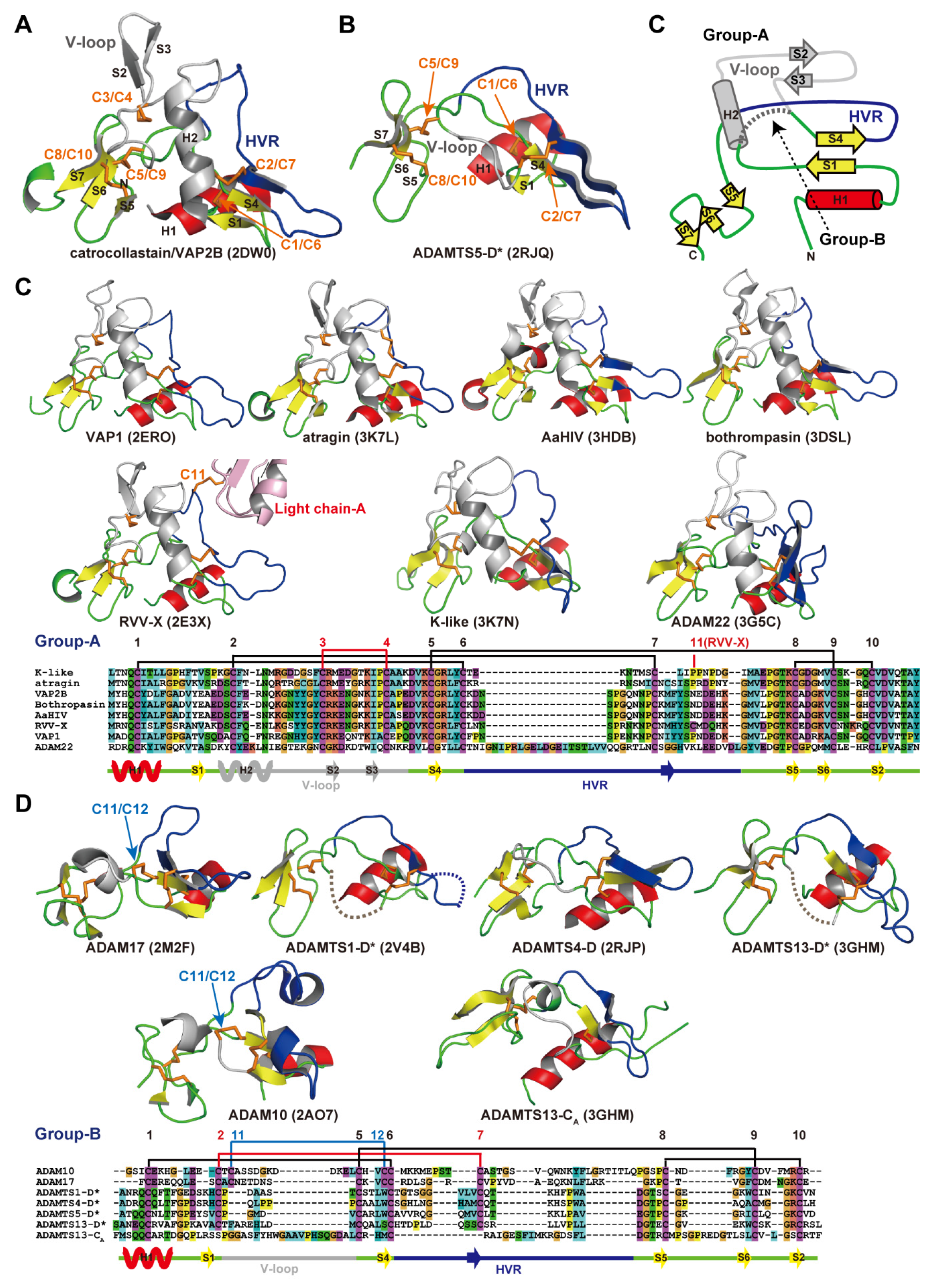 ADAM_CR domain. Ribbon representation of the Ch subdomains of catrocollastatin/VAP2B (A) and the D* domain of ADAMTS5 (B). (C) Topology diagram of the ADAM_CR domain. Gallery of the group-A (C) and group-B (D) ADAM_CR domain structures. Conserved α-helix and β-strands are shown in red and yellow, respectively. Disulfide bonds, residues in HVR, and the residues in the V-loop are shown in orange, blue, and gray, respectively. The PDB ID for each protein structure is indicated in parentheses.