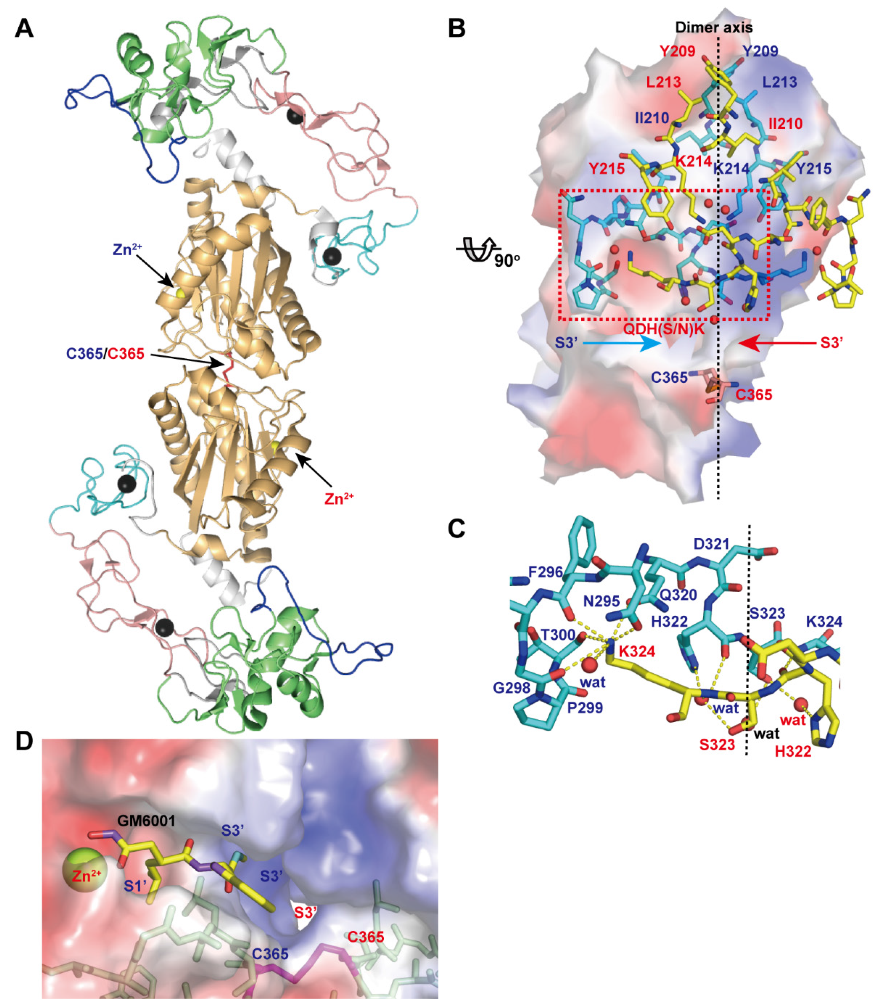 Structure of VAP1, representative of P-IIIc SVMPs. (A) Crystal structure of VAP1 (2ERO) viewed from the dimer axis. (B) Dimer interface viewed from a direction nearly perpendicular to the dimer axis. The molecular surface of the cyan molecule in the back is colored according to electrochemical potential (red to blue). (C) Close up view of the dimer interface. The residues involved in the inter-chain interactions are indicated with blue and red letters for cyan and yellow molecules. (D) Close up view of the catalytic cleft of the VAP1 (shown with the molecular surface)/GM6001 (shown in yellow) complex structure.