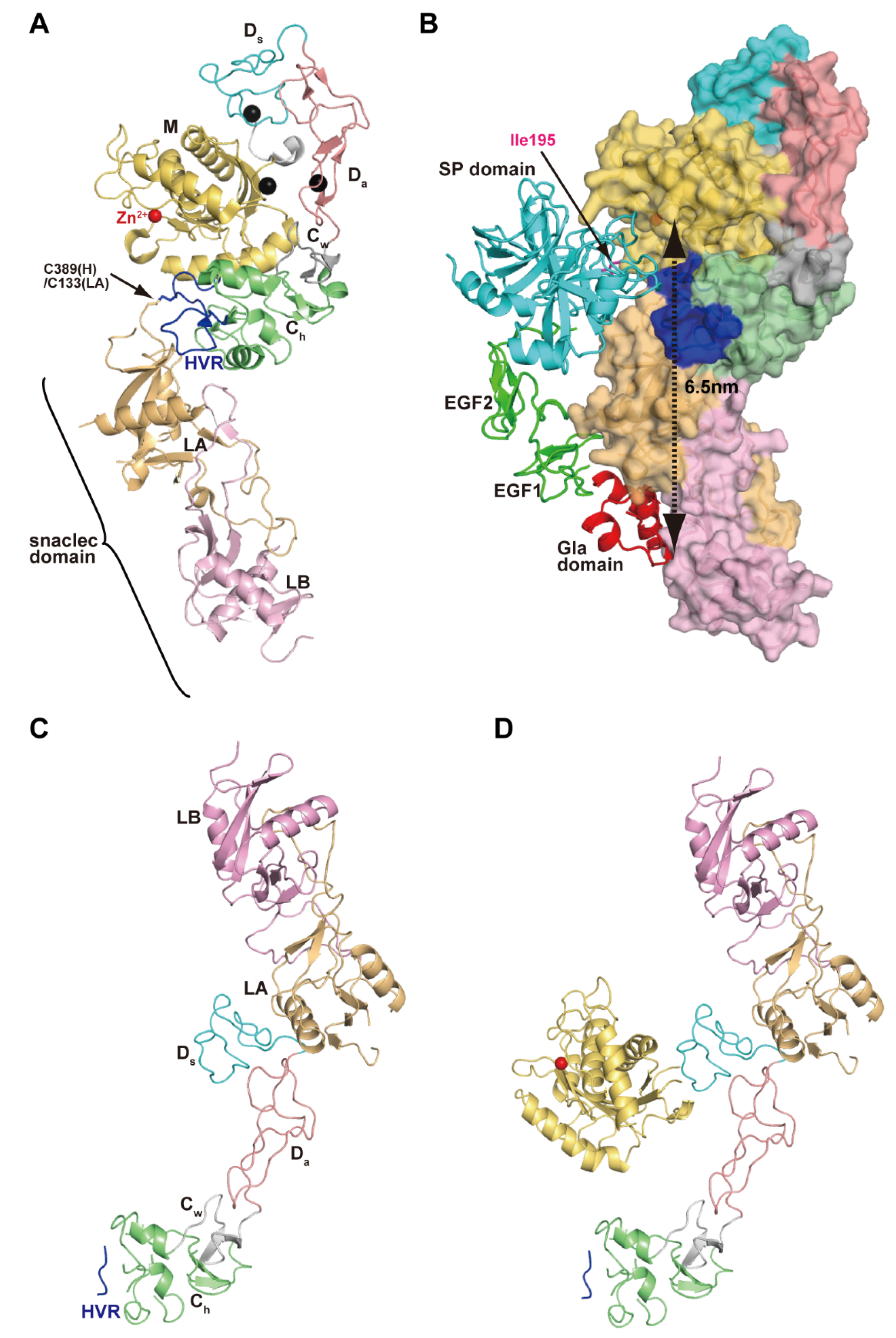 Carinactivase-1 and multactivase are potent prothrombin activators isolated from the venom of Echis carinatus and Echis multisquamatus, respectively [130,131]. They have a snaclec domain in addition to MDC domains, and also use their snaclec domain for prothrombin recognition. Therefore, they are considered to be another example of P-IIId SVMPs. Unlike RVV-X, these two P-IIId SVMPs do not possess a disulfide bond between the heavy chain and snaclec domains, and thus how the catalytic and the regulatory domains interact and are oriented with respect to each other remains unclear. A crystal structure of the proteolytic fragment of multactivase, named multactivase-ΔM because it lacks the M domain from the intact molecule, was recently determined at 2.6Å resolution (Figure 8C) and a structural model of the entire multactivase molecule (Figure 8D) was constructed (S. Takeda and T. Morita, unpublished work). Each subdomain in multactivase is similar in structure to the corresponding one in RVV-X. However, the interactions between the heavy chain and the snaclec domain are remarkably different. The snaclec domain interacts with the Ds subdomain in multactivase but the Ch subdomain in RVV-X, resulting in a different overall shape and configuration of the catalytic site and the exosite between these two P-IIId SVMPs. The multactivase structure represents the first crystallographic observation of the interaction between an ADAM D domain and another polypeptide chain, providing additional insights into protein–protein interactions by the M12B clan of proteinases.