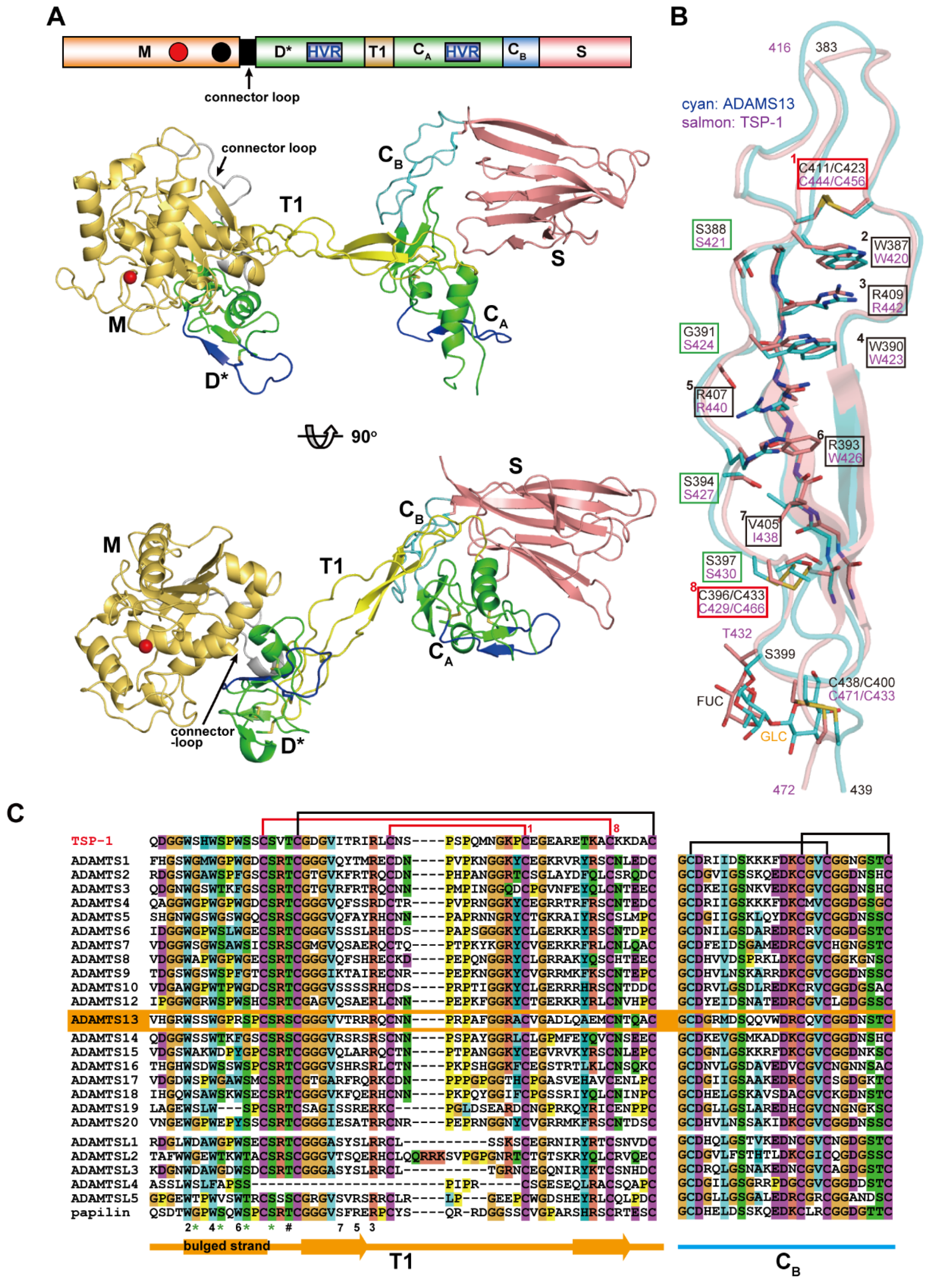Structure of the core MD*TCS domains of ADAMTS proteinases. (A) A structural model of the MD*TCS domains of ADAMTS13 in two different views. (B) T1 structure of ADAMTS13 (shown in cyan) superposed onto the TSR2 in TSP-1 (PDB ID: 1LSL, shown in salmon). The residues that form the CWR-layered core (boxed in black and red), the serine residues in the bulged strand that form the hydrogen bond network (boxed in green) and the O-linked carbohydrate are indicated. (C) Sequence alignment of the T1 and the CB subdomain regions of human TSP-1, ADAMTSs, ADAMTS-L and papilin. The residues involved in the CWR-layered core are indicated by layer number. Conserved serine residues and O–linked glycosylation sites are marked with * and #, respectively. The GI numbers for each ADAMTS-L sequence are, ADAMTS-L1 (GI: 37181773), ADAMTS-L2 (GI: 1232266328), ADAMTS-L3 (GI: 145275198), ADAMTS-L4 (GI: 187954849), ADAMTS-L5 (GI: 115311311) and papilin (GI: 145309328).