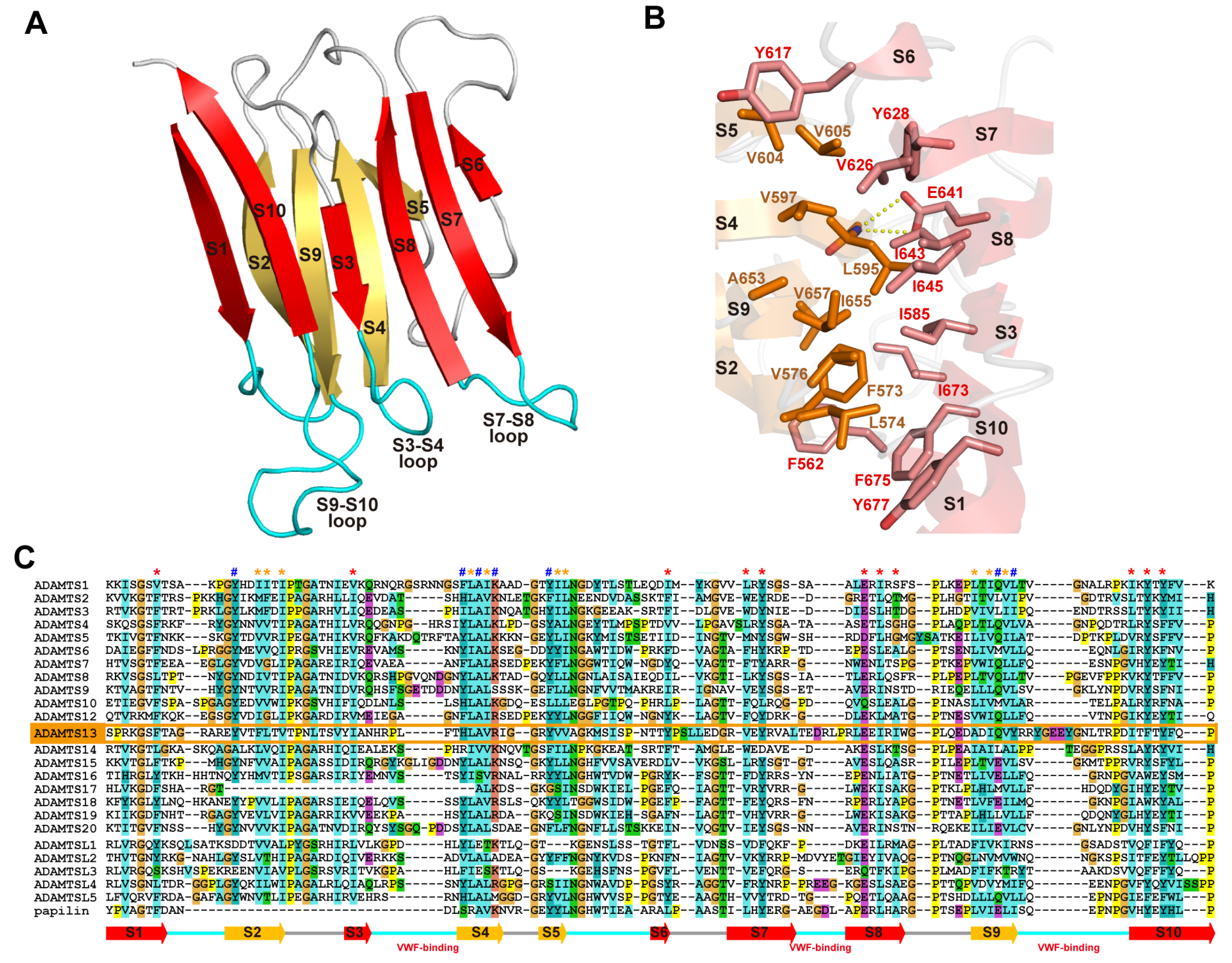 S domain structure. (A) Ribbon representation of the crystal structure of the S domain of ADAMTS13. The strands in the two β-sheets are shown in red and orange. (B) Close-up view of the hydrophobic core between the β-sheets. Side chains forming the hydrophobic core and the conserved Glu641, whose side-chain oxygen atoms make hydrogen bonds with the backbone nitrogen atom of Leu595 in the opposing strand, are indicated. (C) Sequence alignment of the S domain of human ADAMTSs, ADAMTS-L and papilin. The residues in the hydrophobic core and the conserved aromatic surface cluster [53] are marked with * and #, respectively.