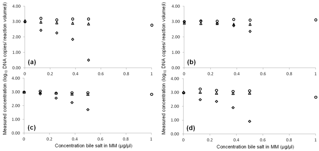 Influence of increasing concentrations of bile salt on the measured target DNA copies in qPCR-EMM (○), qPCR-UMM (◊) and ddPCR (∆) for eae (a), stx1 (b), stx2 (set a) (c) and stx2 (set b) (d) quantification. MM: mastermix.