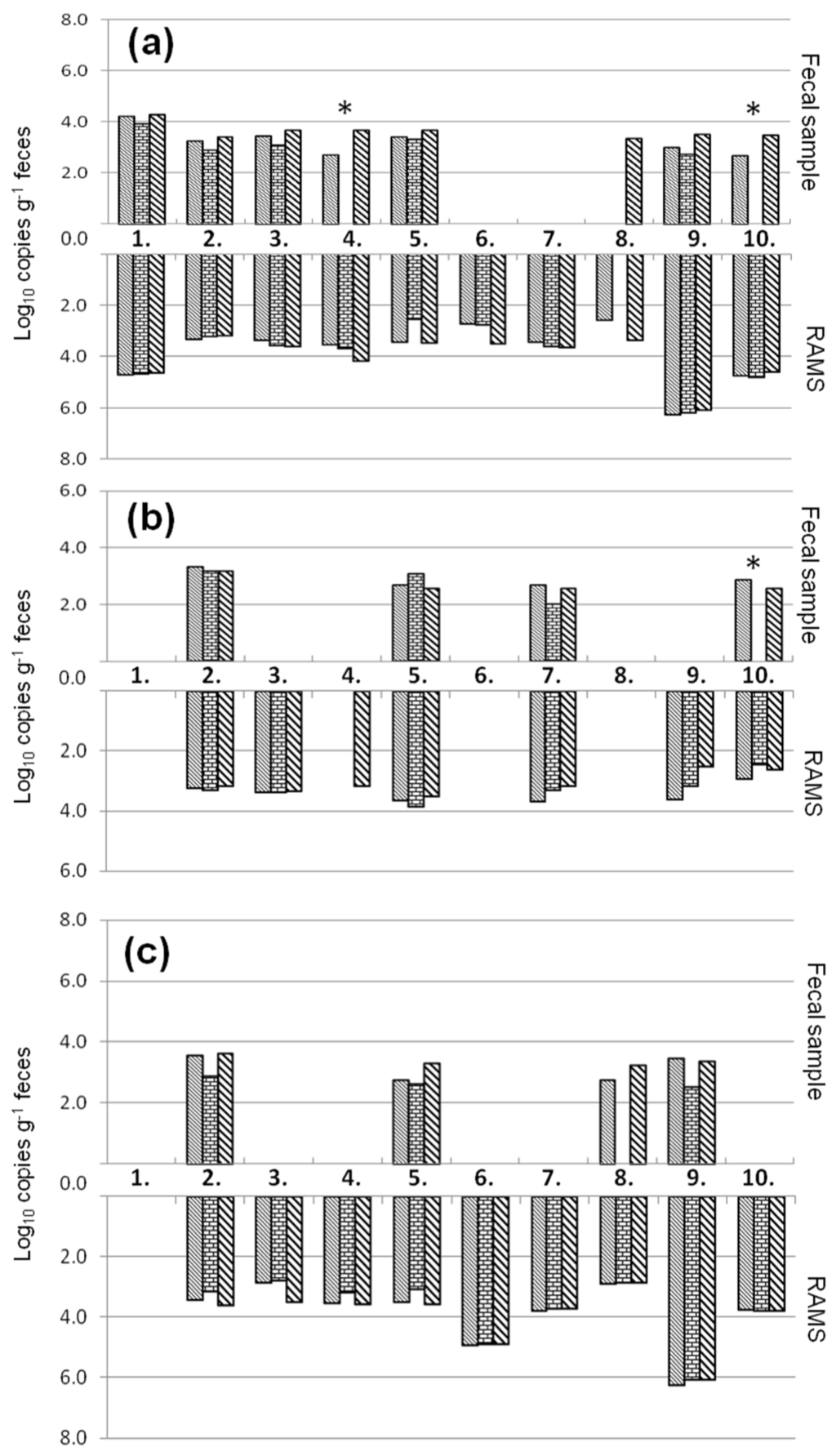 in cattle fecal samples and recto-anal-mucosal swabs (RAMS) of ten animals (1–10) of a STEC-positive farm. * Cattle fecal samples that showed PCR inhibition for the internal amplification control.
