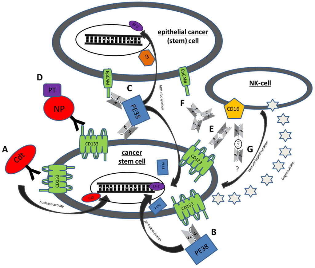Mechanisms of action of some genetically engineered CSC Targeting Drugs. (A) C178ABC-CD133MAb is a monospecific anti-CD133 antibody that is conjugated to cytolethal distending toxin (Cdt). This toxin has nuclease activity and induces DNA damage in host cells. (B) Deimmunized CD133KDEL (dCD133KDEL) consists of an anti-CD133 scFv on the same single chain molecule as truncated deimmunized pseudomonas exotoxin A (PE38). It induces ADP-ribosylation of elongation factor 2 (EF-2) leading to irreversible inhibition of protein synthesis. (C) Deimmunized EpCAMCD133KDEL (dEpCAMCD133KDEL) consists of two ligands, anti-CD133 scFv and anti-EpCAM scFv with the same deimmunized PE toxin. (D) NP133 is a nanoparticle [NP] linked to an anti-CD133 antibody and loaded with paclitaxel [PT], a microtubule-stabilizing anticancer drug. (E) CD16 × 133 is a bispecific scFv to target CD133 and thereby forming an immune synapse with anti-CD16 on NK-cells resulting in induction of ADCC. (F) 133EpCAM16 is a trispecific construct, targeting CD133, EpCAM, and CD16. (G) 161533 TriKE consists of an anti-CD33 and anti-CD16 scFv and a modified IL-15 linker but might also be modifiable to a 1615133 TriKE. It induces NK expansion and ADCC.
