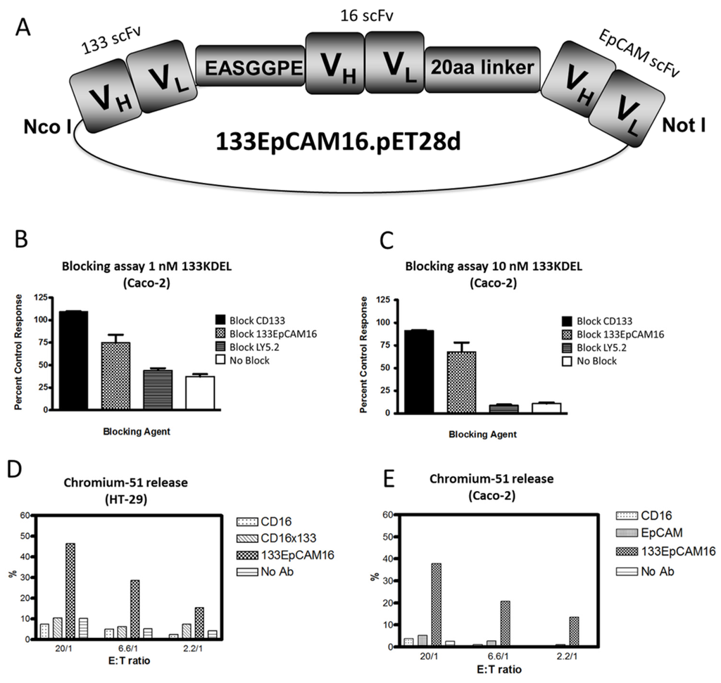 Engineering of 133EpCAM16 TriKE. (A) Construction of trispecific hybrid protein 133EpCAM16 NK-cell engager (TriKE). From left to right, the plasmid contains VL and VH regions of anti-133 scFv spliced to anti-CD16 scFv then to VL and VH regions of anti-EpCAM. The Figure shows all 3 of the ligands are active. To show that the anti-CD133 scFv was intact, we tested the ability of 133EpCAM16 to block the binding of the highly selective and potent targeted toxin CD133KDEL in (B,C). Caco-2 cells (40% CD133+, <95% EpCAM) were exposed to the targeted toxin 133KDEL in a concentration of 1 nM and 10 nM and blocked with 500 nM anti-CD133 scFv or 133EpCAM16 or negative control LY5.2 (anti-mouse CD45 antibody). The anti-CD133 scFv alone as well as the anti-CD133 scFv moiety of the TriKE sufficiently blocked CD133KDEL related killing in a tritiated thymidine uptake assay. To show that the anti-EpCAM scFv was intact, a 51Chromium release assay was performed with EpCAM+CD133− HT-29 (D) and EpCAM+CD133+ Caco-2 (E) targets. 133EpCAM16 was able to kill HT-29, but a control CD16 × 133 scFv was not. Furthermore 133EpCAM16 was also able to kill Caco-2 targets whereas control scFvs did not. Since CD16 binding is required for the ADCC to occur, the anti-CD16 ligand was also intact.